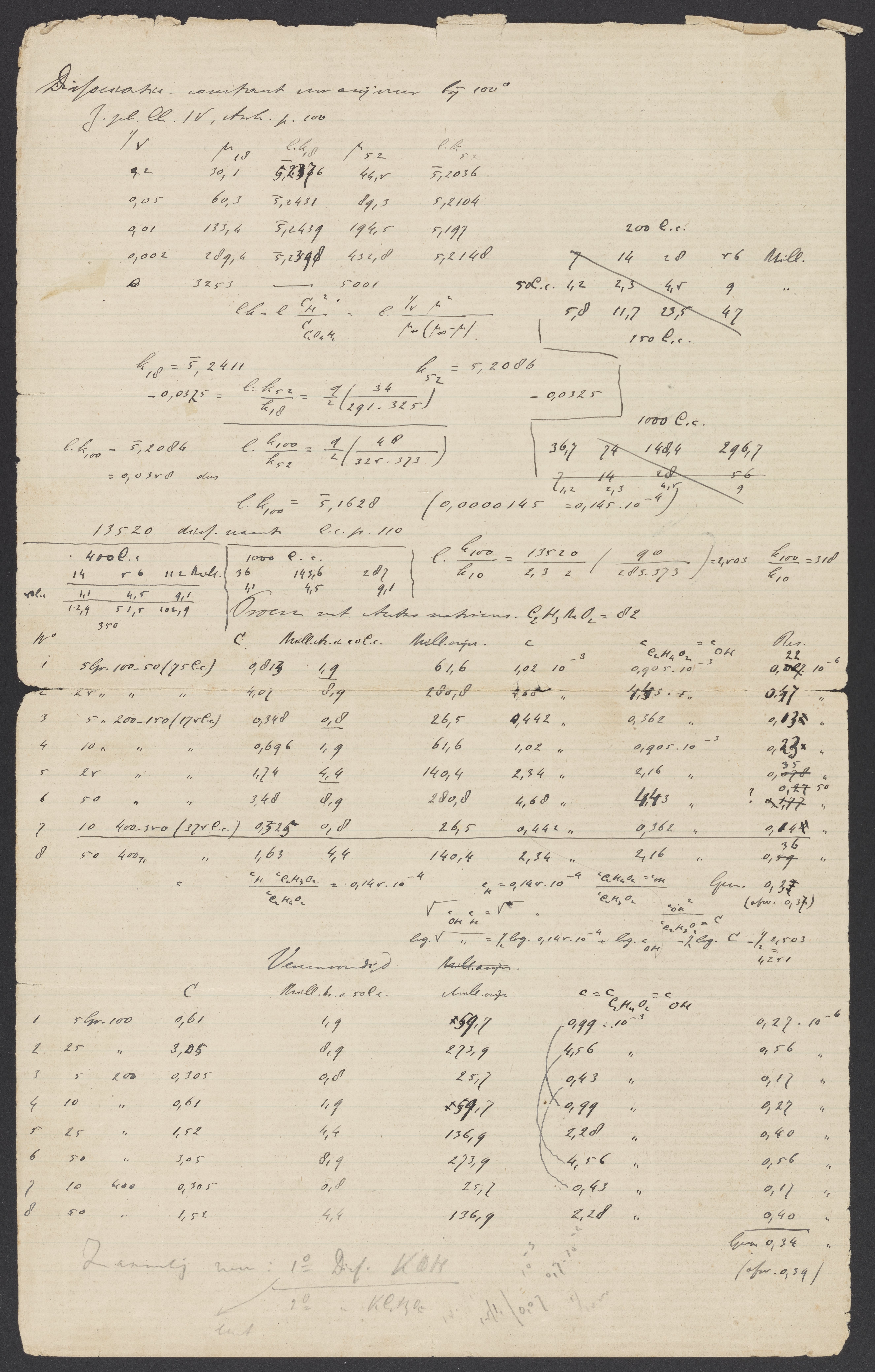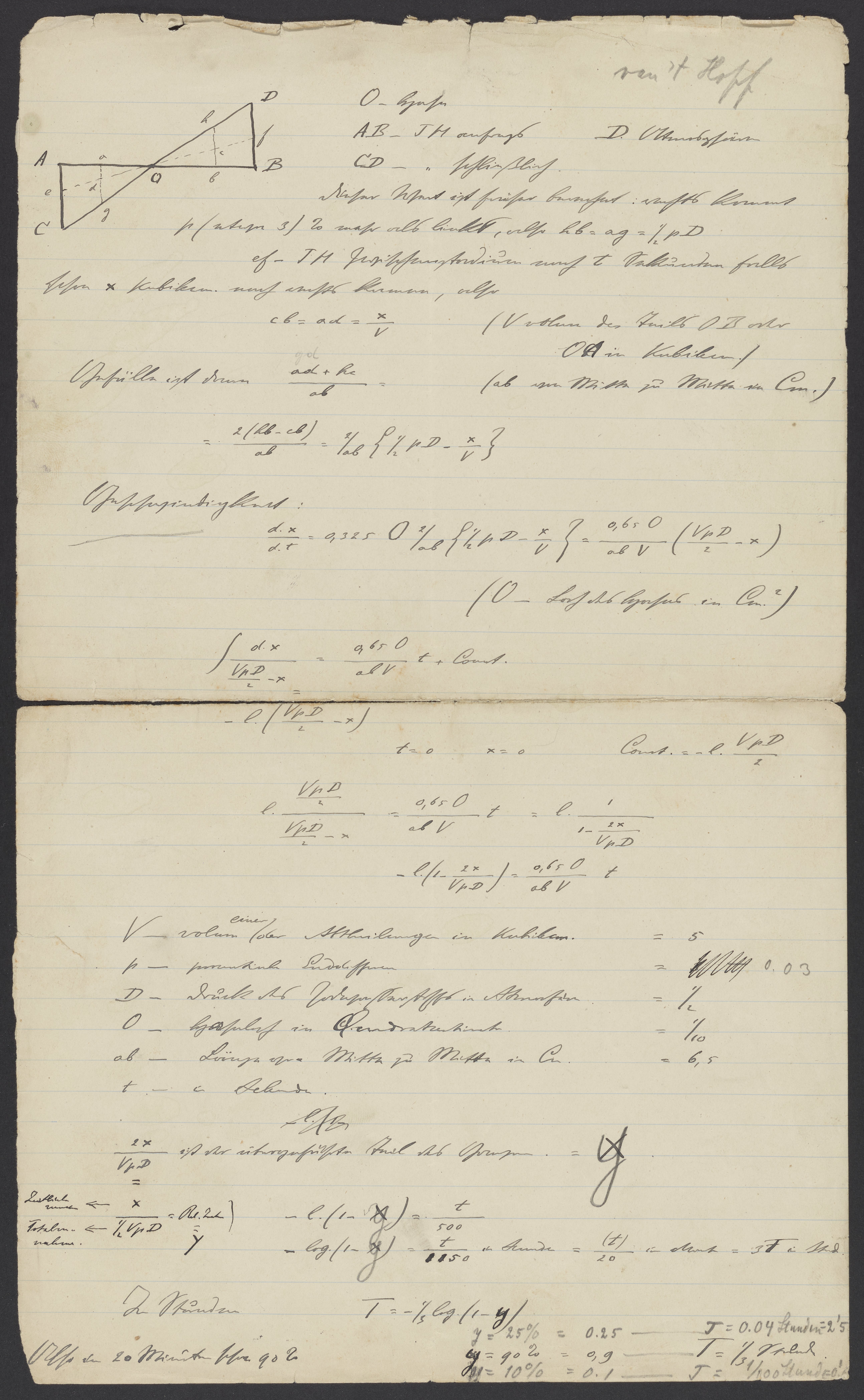 Small JPG1200 x 1881px — 339 KBLarge JPG2880 x 4515px — 1.7 MBFull-sized JPG5302 x 8312px — 5.0 MBOriginal fileTIFF — 5302 x 8312px — 126 MBNotes handwritten by Dutch physical chemist, Jacobus H. van’t Hoff (1852-1911). Van’t Hoff was the first winner of the Nobel Prize in chemistry in 1911 and is considered to be one of the lead pioneers of the field of physical chemistry.