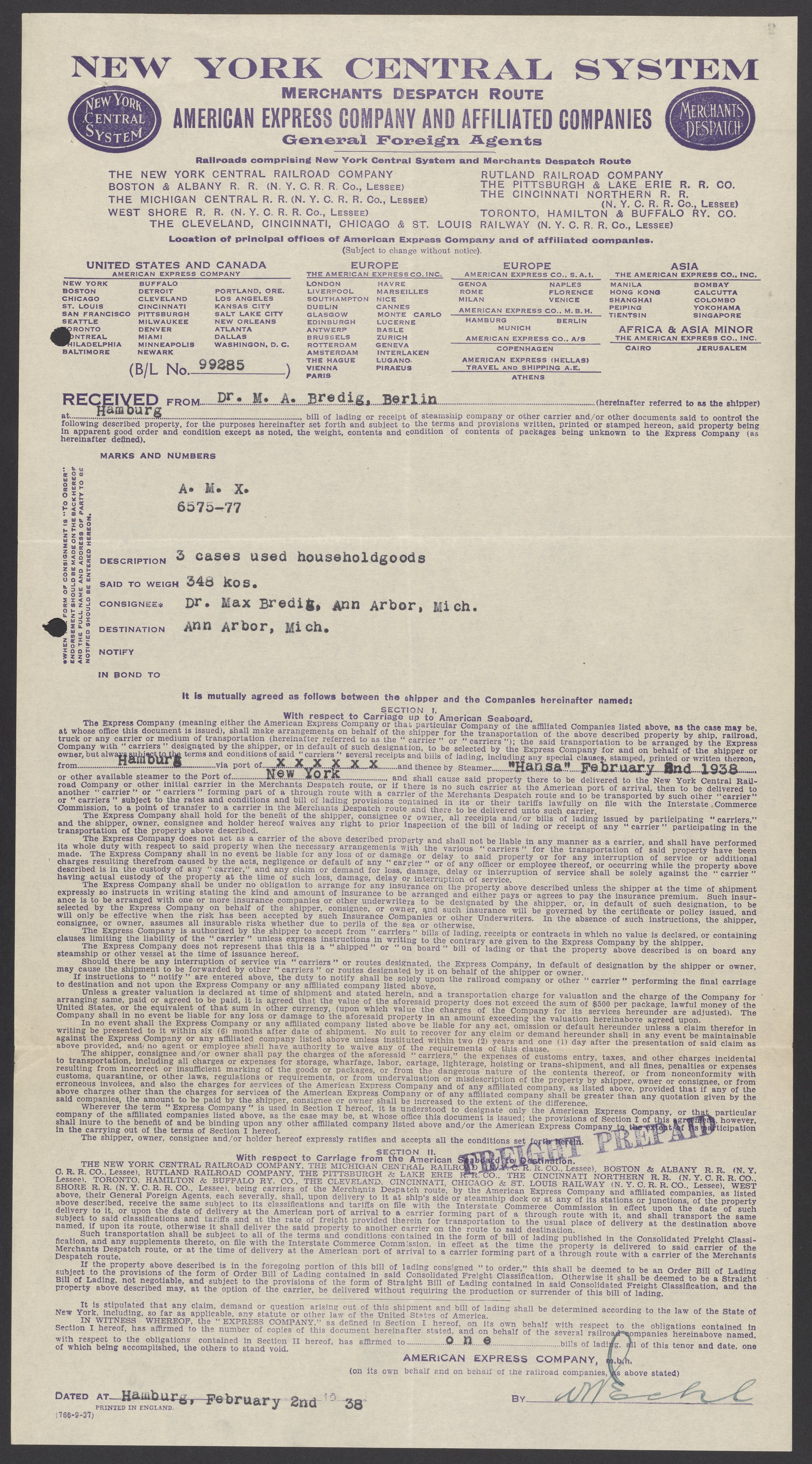 New York Central Railroad Company. “Shipping Order from the New York Central System and Other Railroad Companies,” February 2, 1938. Papers of Georg and Max Bredig, Box 10, Folder 17. Science History Institute. Philadelphia. https://digital.sciencehistory.org/works/n25u4ib.