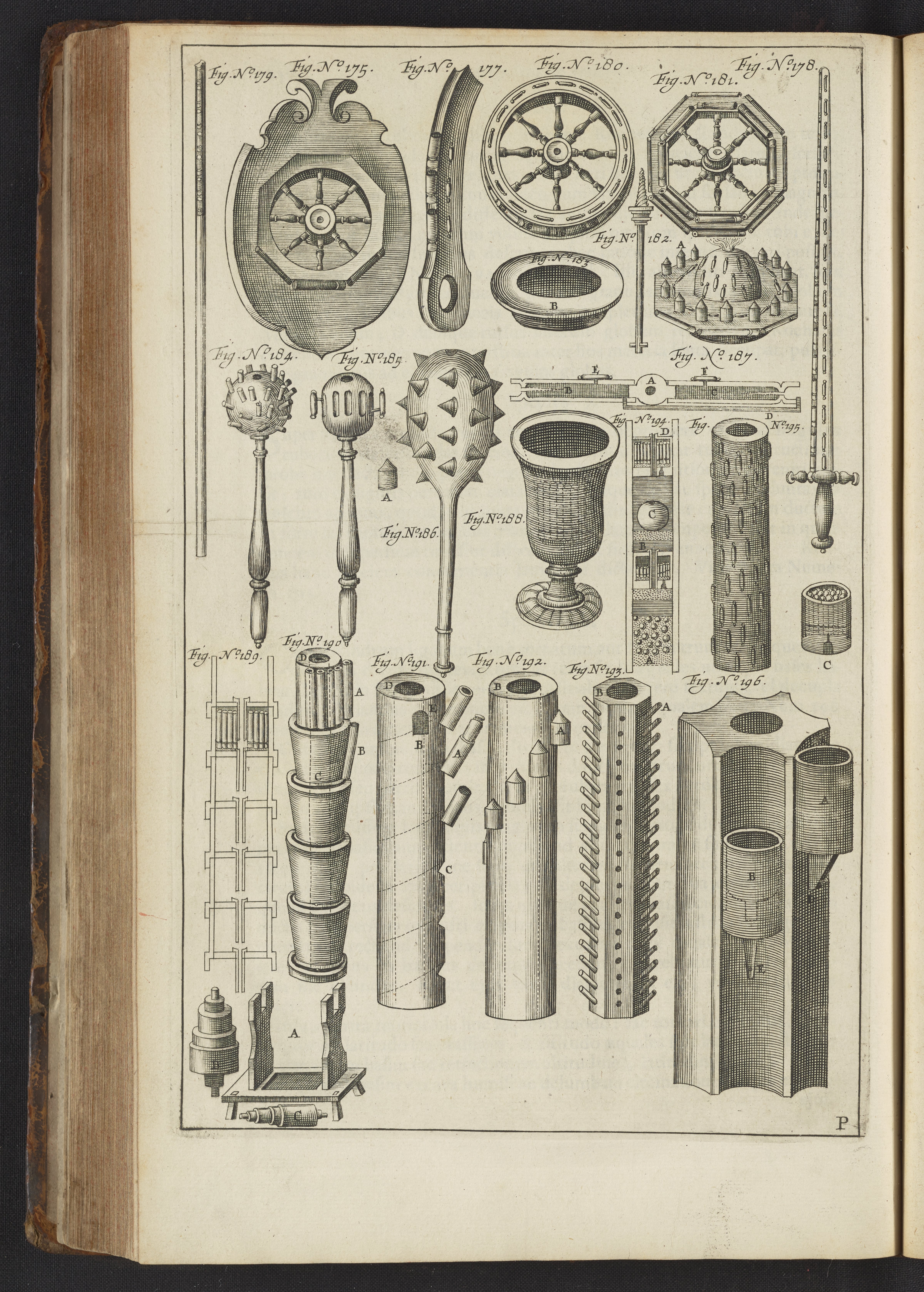 Siemienowicz, Kazimierz. “Plate P: Pyrotechnic Shield; Pyrotechnic Hand Weapons; Fire Wheels and Their Parts; Pyrotechnic Cases.” In Artis Magnae Artilleriae. Amsterdam, Netherlands: Jan Jansson, 1650. https://digital.sciencehistory.org/works/n296wz16q.