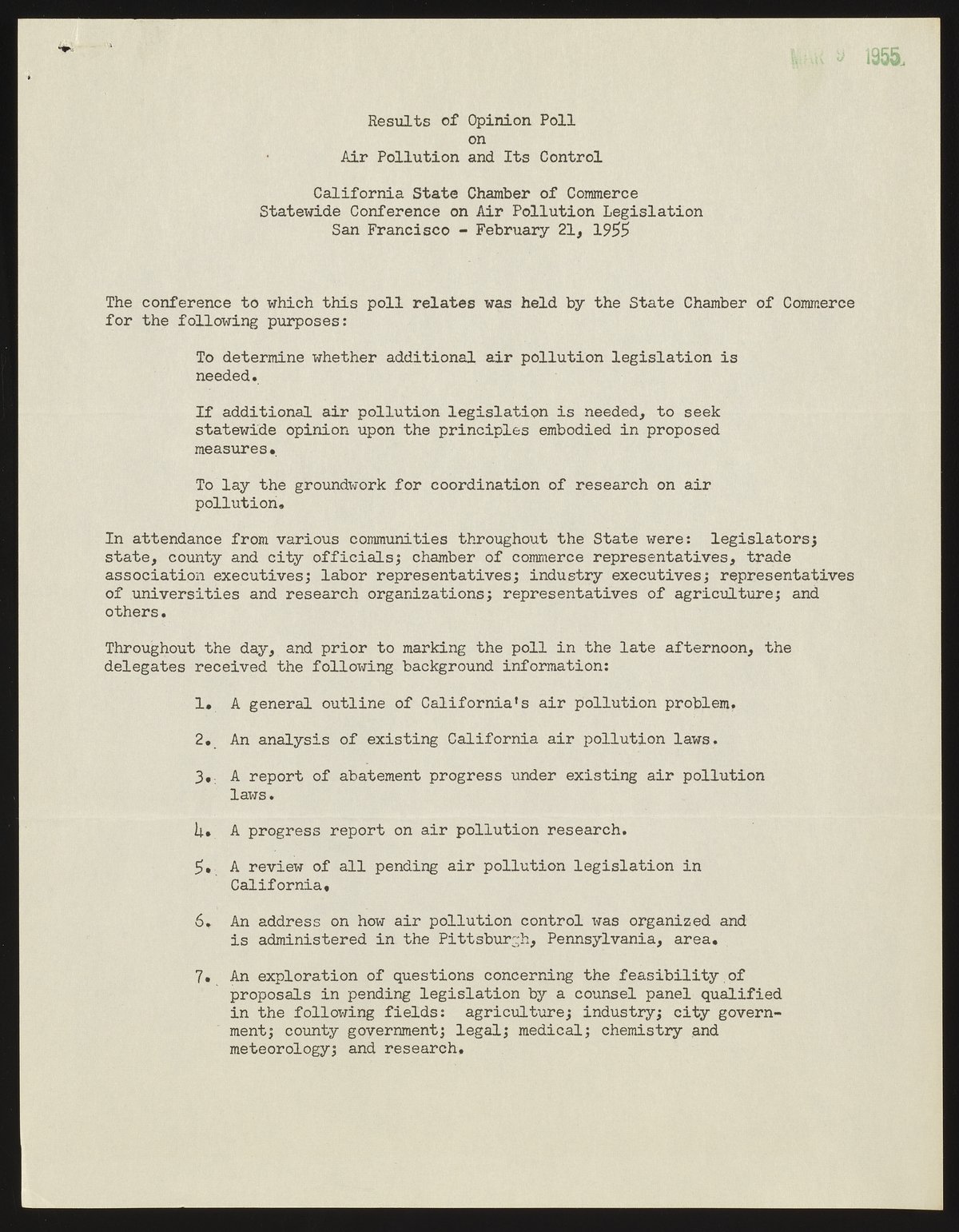 Small JPG1200 x 1541px — 282 KBFull-sized JPG2756 x 3540px — 1.3 MBOriginal fileTIFF — 2756 x 3540px — 28.0 MBThis survey was conducted at the Statewide Conference on Air Pollution Legislation, held in San Francisco on February 21, 1955. The results indicate that (among other things) attendees favored creating new air pollution legislation on a regional basis, with those regions based on natural atmospheric boundaries. Respondents also supported federal and state tax incentives for any installation of pollution-controlling equipment, state funded research into the causes of air pollution, and only proceeding with abatement procedures if an emission had been proved harmful through that research.