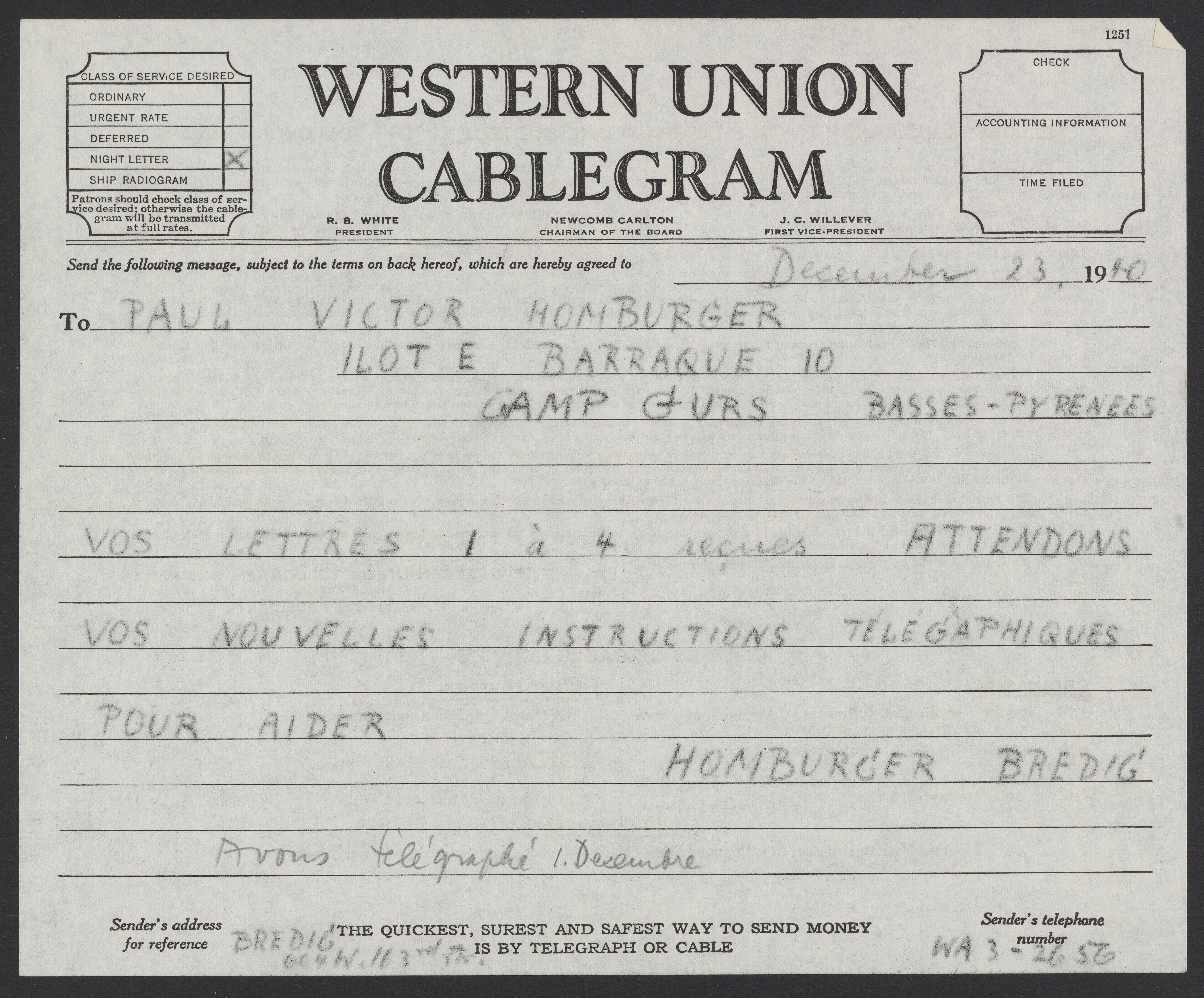Cablegram from Max Bredig to Paul and Viktor Homburger, December 23, 1940
