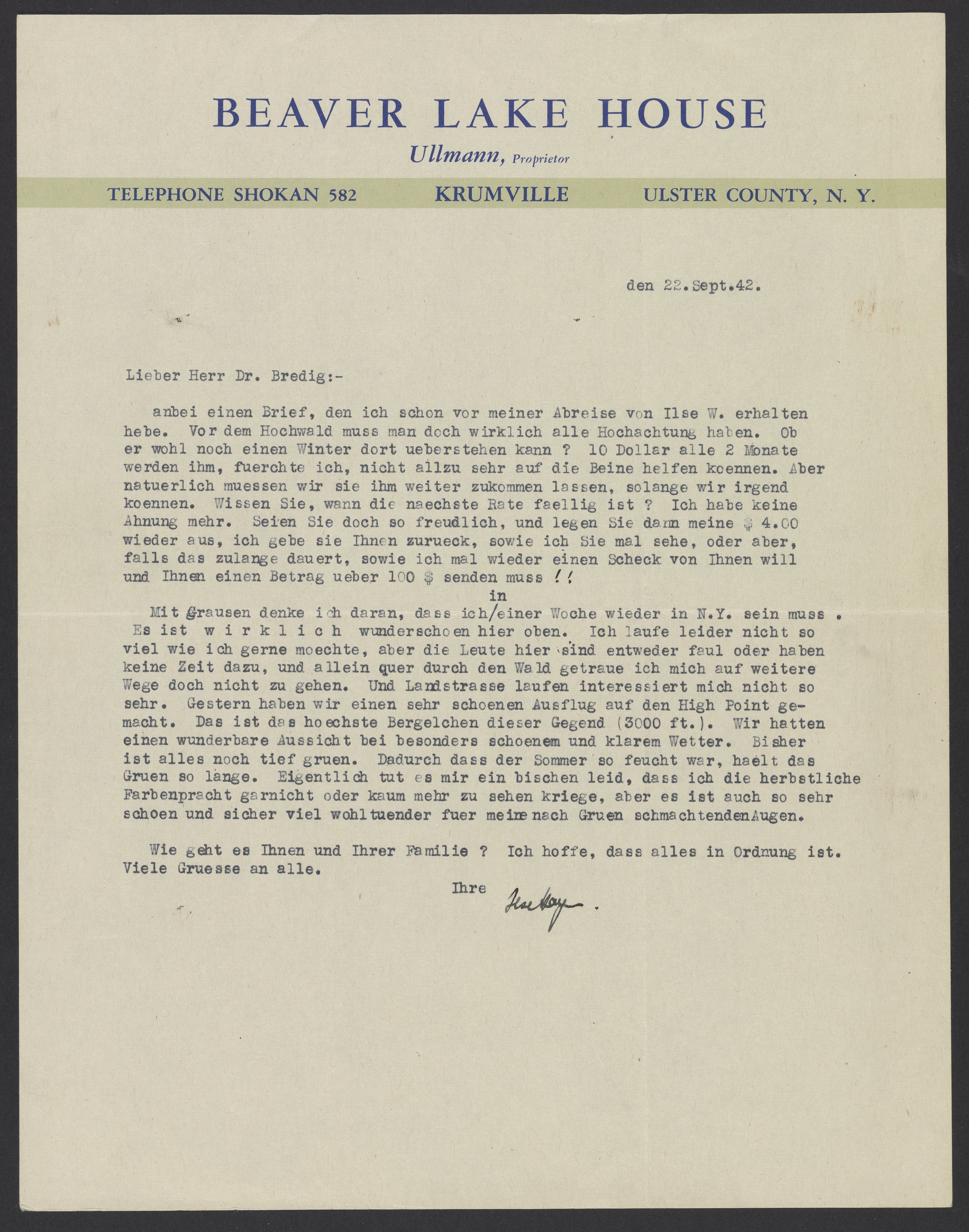 Letter from Ilse Hayn to Max Bredig, September 22, 1942
