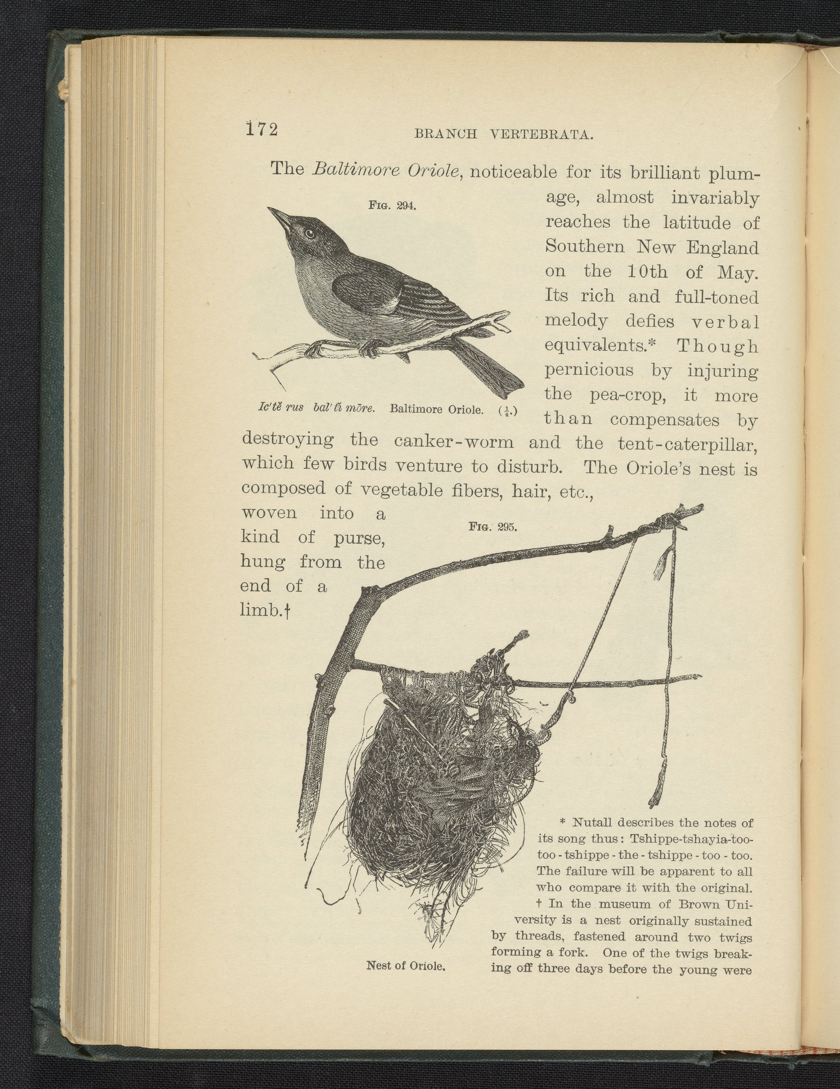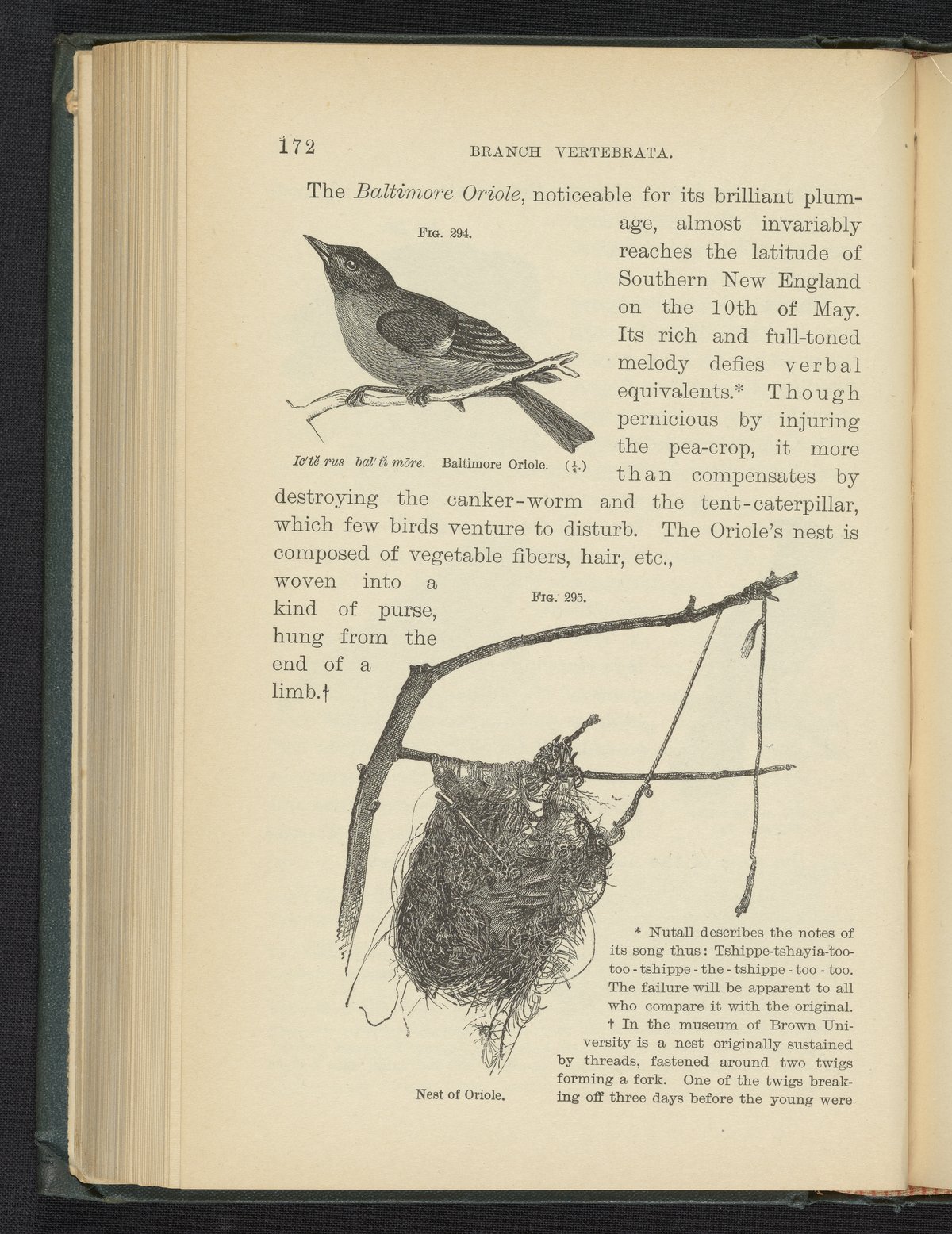 Steele, Joel Dorman, and Jenks, J. W. P. (John Whipple Potter). “Figure 294. Baltimore Oriole. Figure 295. Nest of Oriole.” Popular Zoology. New York, New York: Chautauqua Press, 1887. https://digital.sciencehistory.org/works/n4o6muq.