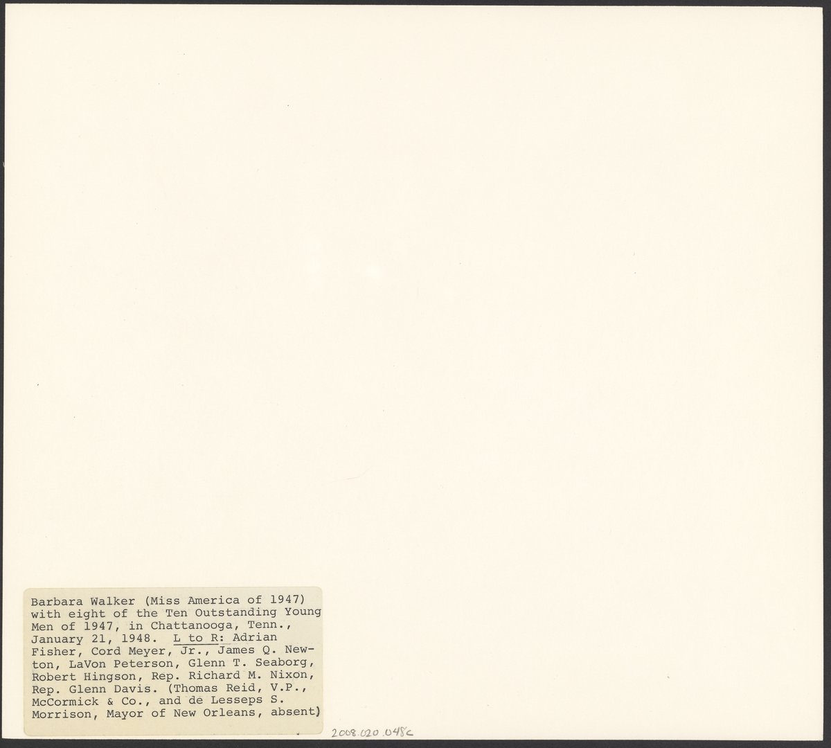 Small JPG1200 x 1082px — 108 KBLarge JPG2880 x 2596px — 607 KBFull-sized JPG6843 x 6169px — 3.2 MBOriginal fileTIFF — 6843 x 6169px — 121 MBBlack and white photograph of Miss America 1947, Barbara Walker (1926-2000) posed with eight of the Ten Outstanding Young Men of 1947 awardees standing on a staircase. Pictured left to right are Walker, Adrian S. Fisher (1914-1983), Cord Meyer Jr. (1920-2001), James Quigg Newton (1911-2003), LaVon Peterson (1919-2004), Glenn T. Seaborg (1912-1999), Robert Hingson (1913-1996), Rep. Richard M. Nixon (1913-1994), and Glenn Davis (1914-1988). Two of the awardees, Thomas Reid VP and de Lesseps S. Morrison (1912-1964), were not present for the photograph.
