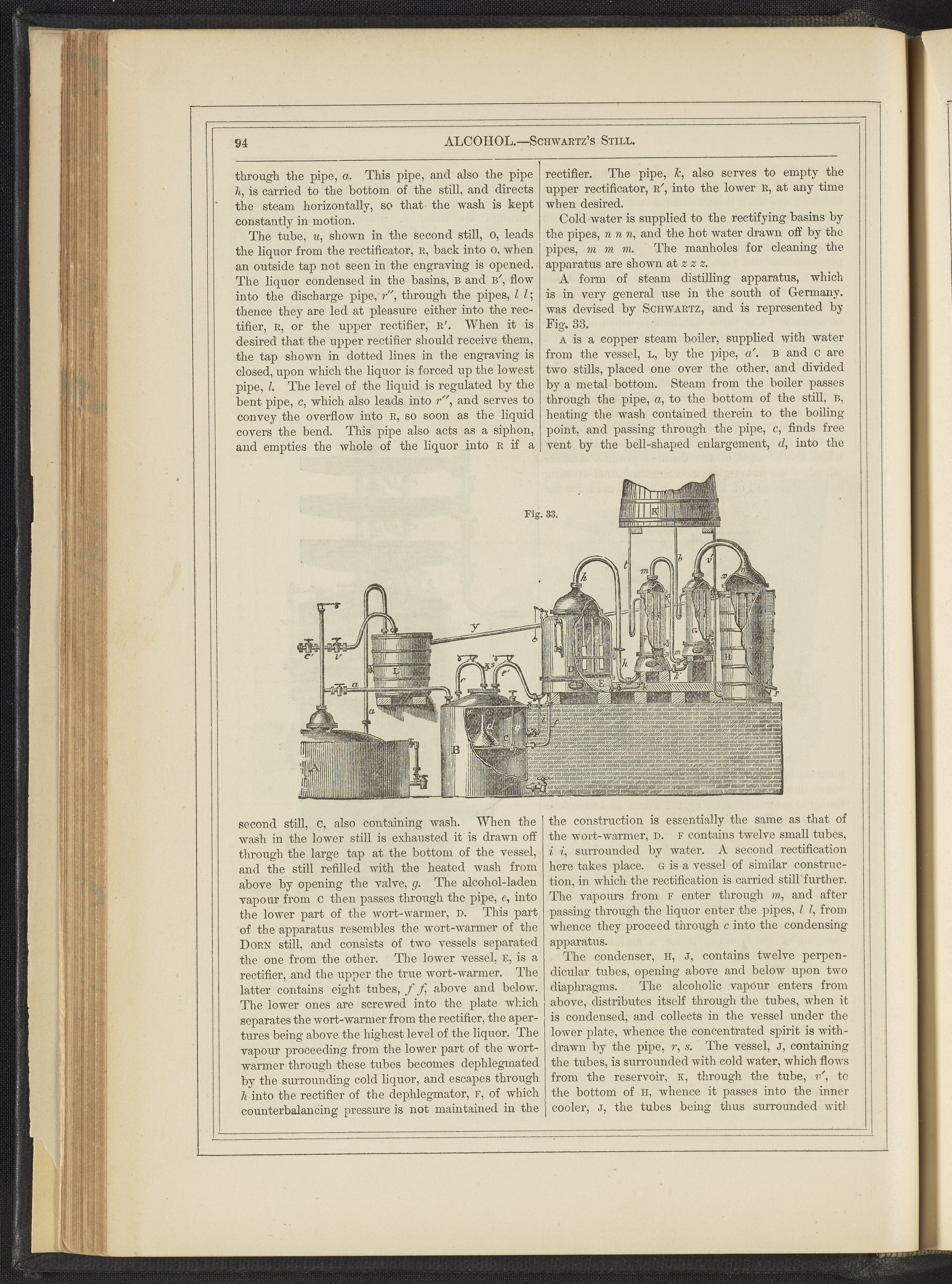 “Schwartz's Still for the Distillation of Alcohol.” In Encyclopædia of Chemistry, Theoretical, Practical, and Analytical, as Applied to the Arts and Manufacturers, Vol. I and II. Philadelphia, Pennsylvania: J.B. Lippincott & Co., 1877. https://digital.sciencehistory.org/works/n583xv05f.