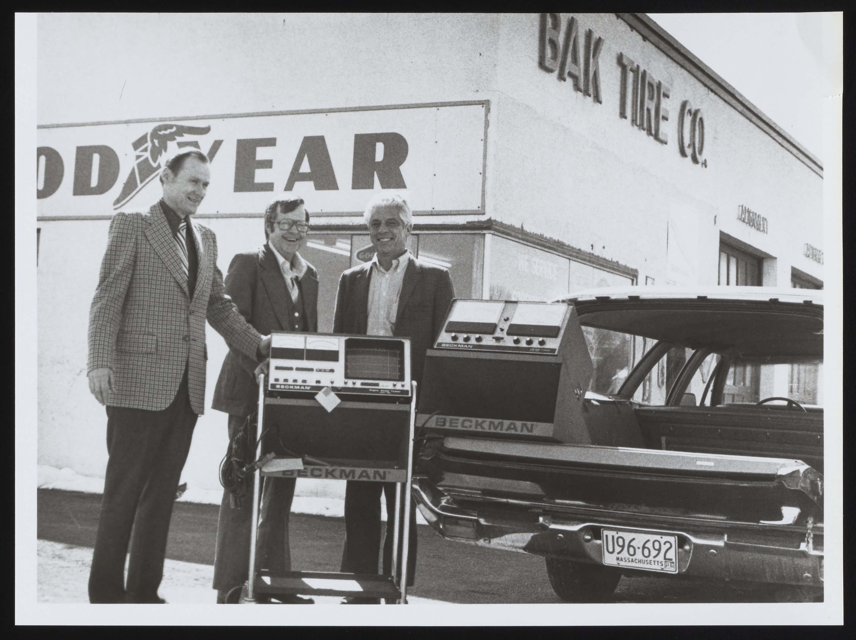 Three men outside a garage with Beckman auto emissions test equipment and a vehicle