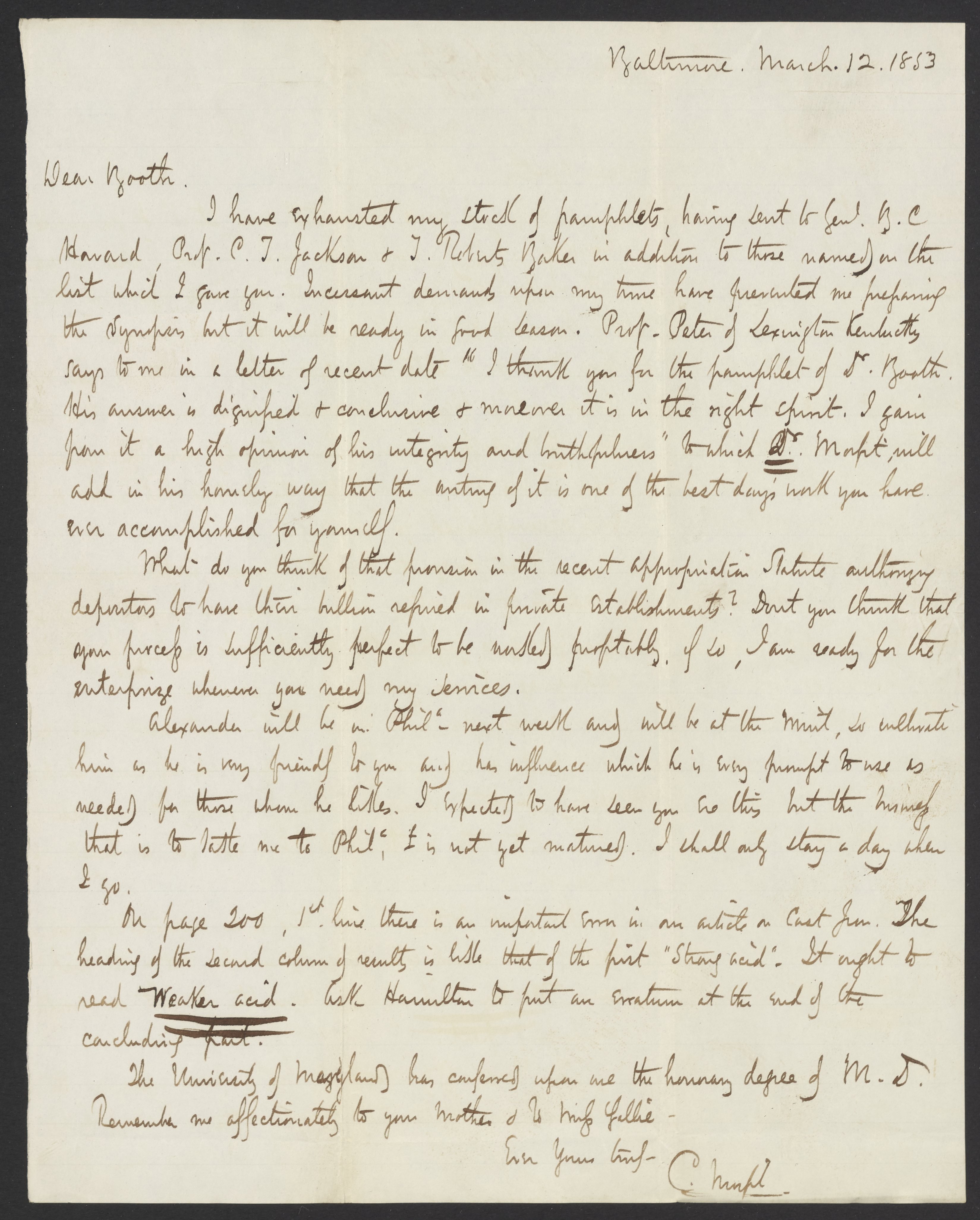 Morfit, Campbell. “Letter from Campbell Morfit to James Curtis Booth, March 12, 1853,” March 12, 1853. Papers of James Curtis Booth, Box 1, Folder 10. Science History Institute. Philadelphia. https://digital.sciencehistory.org/works/n5g0hso.