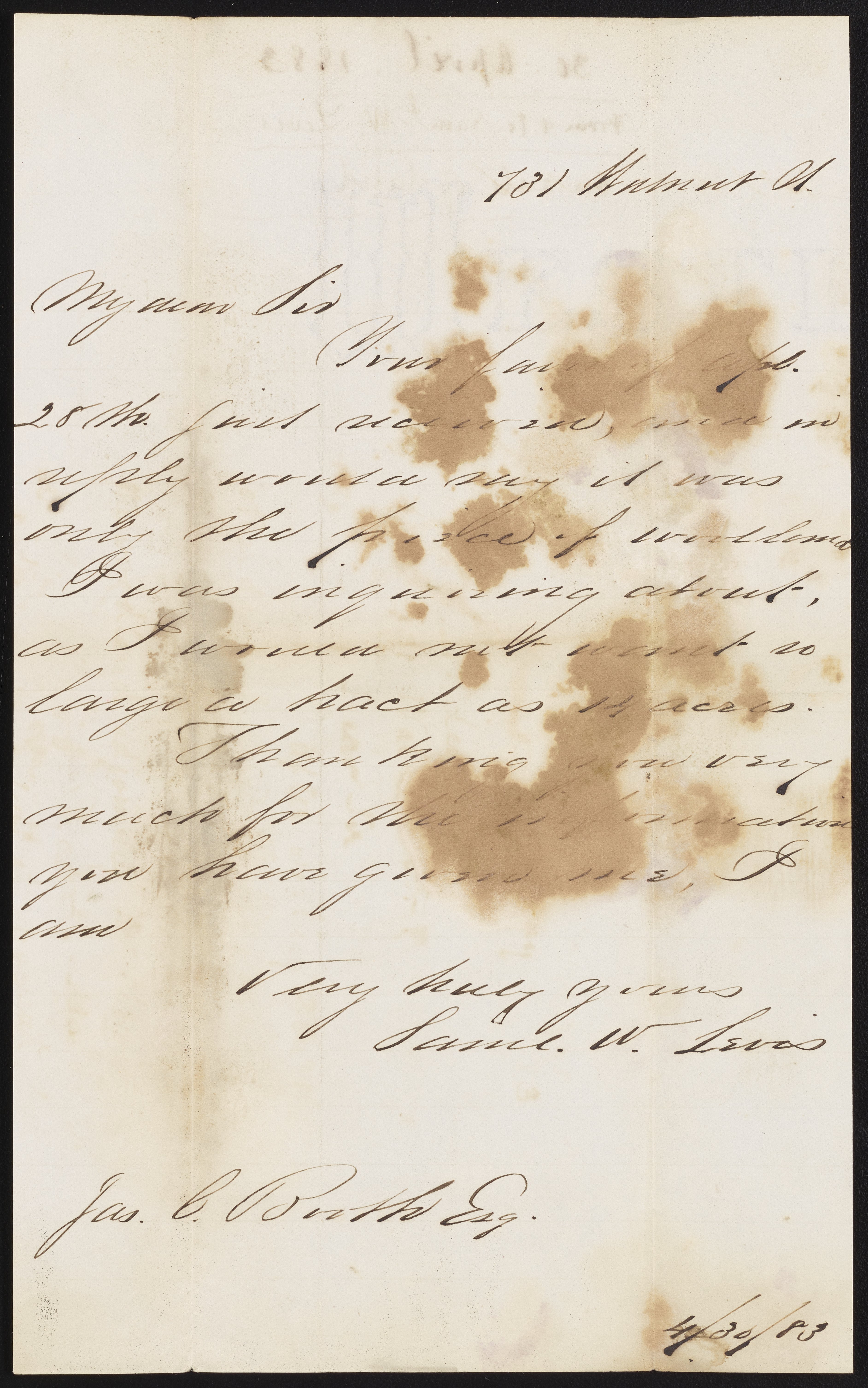 Letter from Samuel W. Levis to James Curtis Booth, April 30, 1883