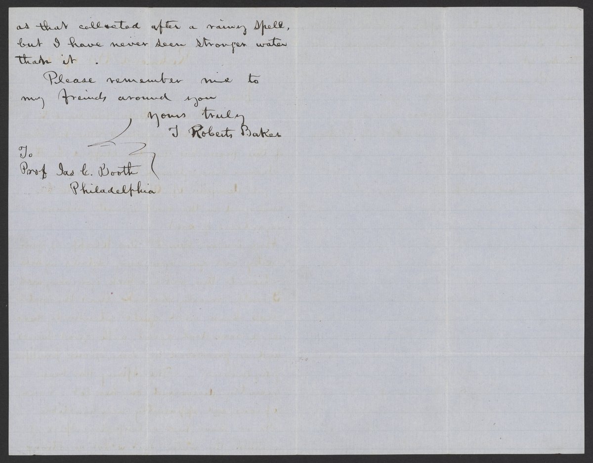Small JPG1200 x 1849px — 402 KBFull-sized JPG2183 x 3363px — 1.1 MBOriginal fileTIFF — 2183 x 3363px — 21.1 MBHandwritten letter to James Curtis Booth (1810-1888) from the James Curtis Booth Papers. Booth, a nineteenth-century analytical chemist, established the first student training laboratory in 1836. He was also the chief melter and refiner of the U.S. Mint in Philadelphia. In his letter, Baker requests an analysis of a 5-gallon demijohn of alum water.