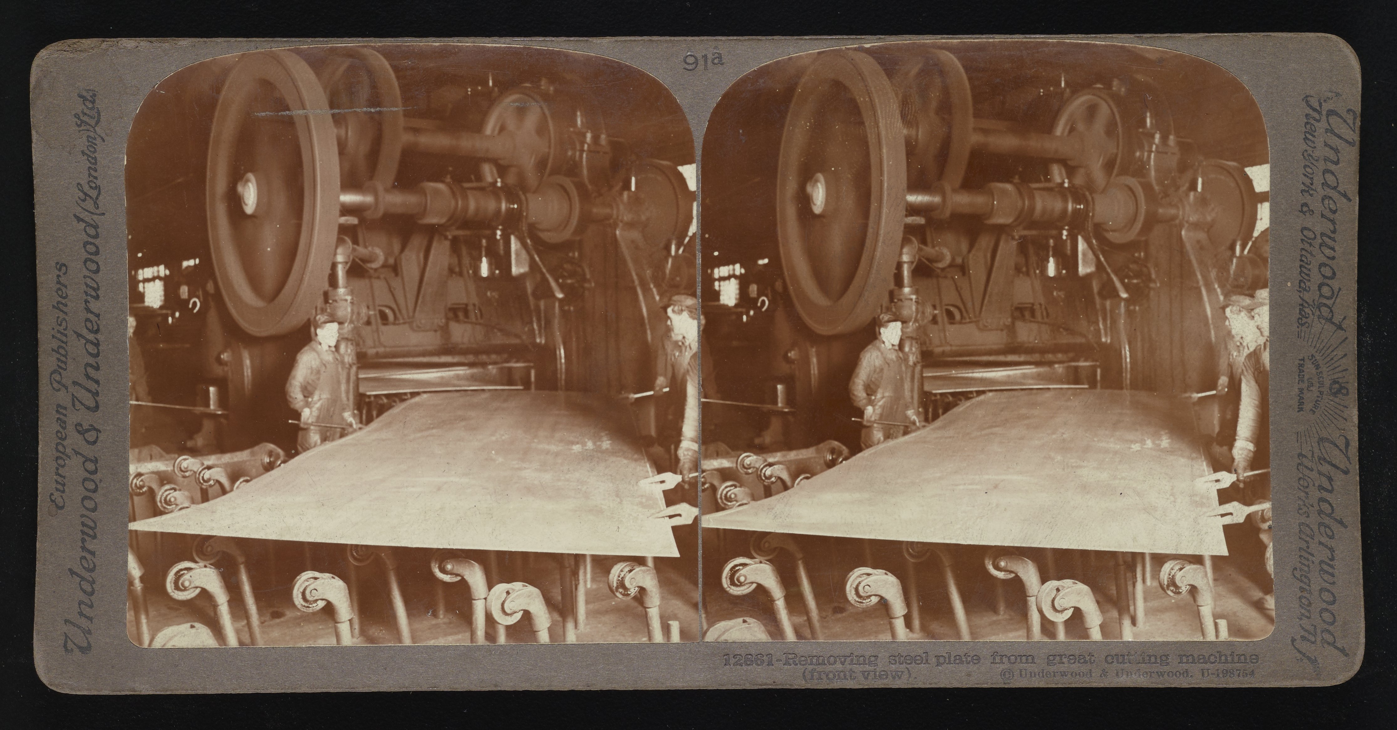 “Removing Steel Plate from Great Cutting Machine (Front View).” Underwood & Underwood, n.d. Underwood & Underwood Stereographs of Manufacturing Industries. Science History Institute. Philadelphia. https://digital.sciencehistory.org/works/n870zq819.