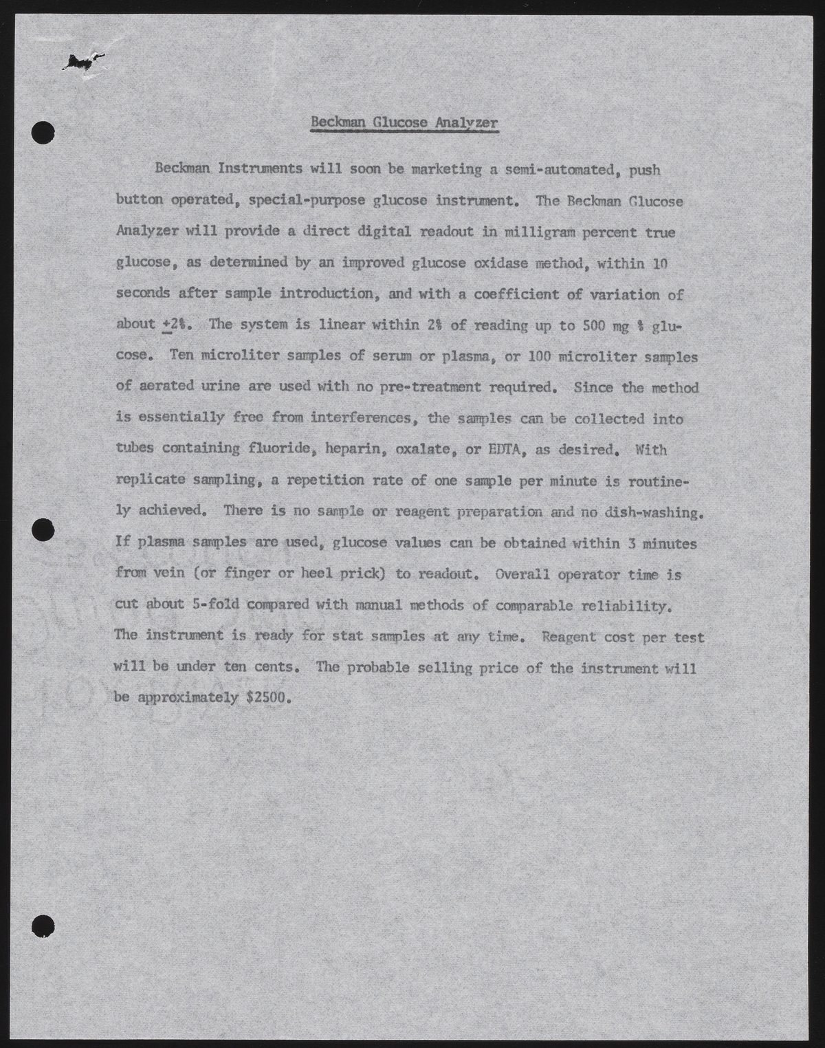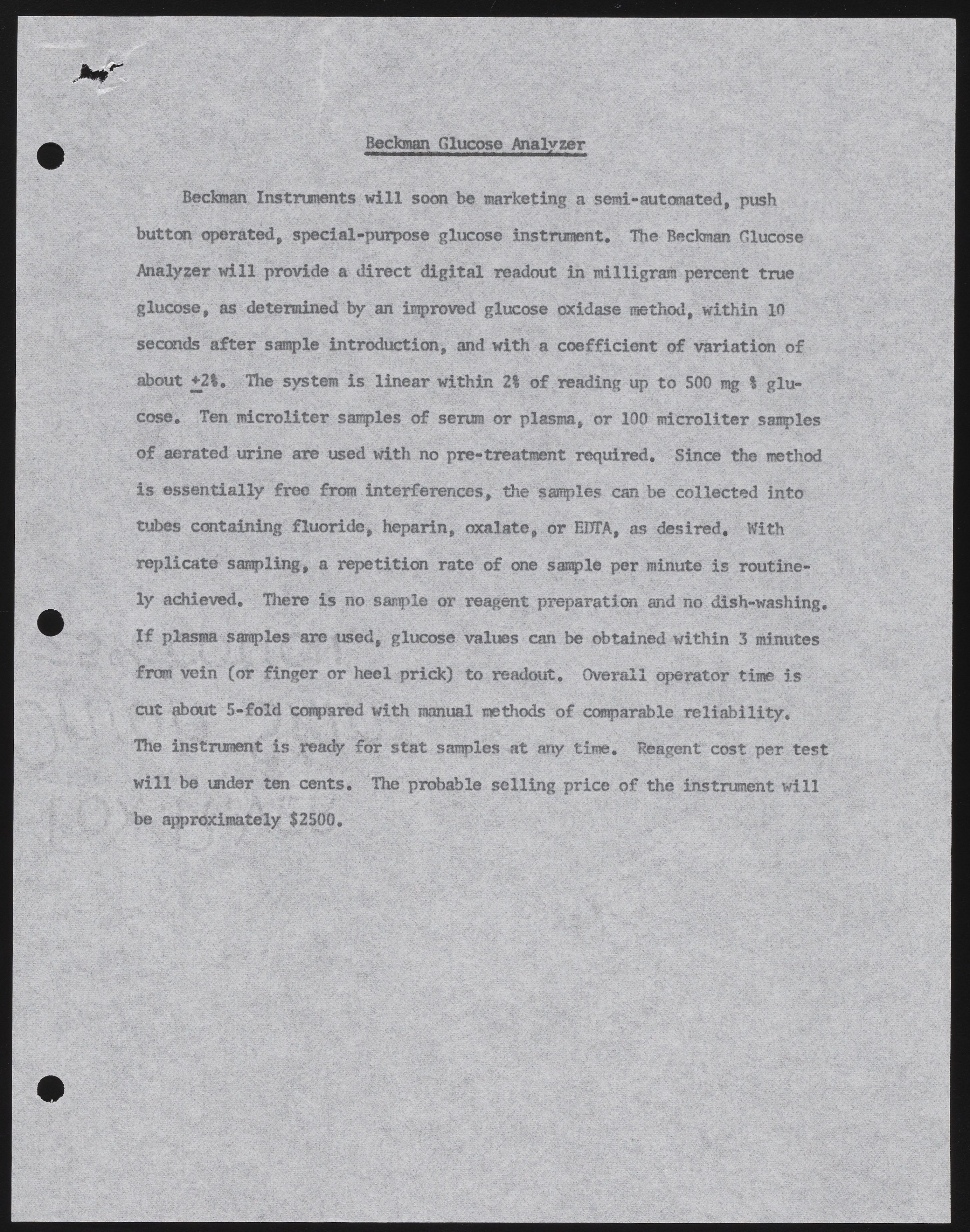 Description of the Beckman Glucose Analyzer written by Dr. James Sternberg. This draft was sent to another Beckman Instruments' employee for feedback, with the ultimate intention of using it in a magazine article and for other publicity purposes. This description may differ from the version that was ultimately published and used for marketing.