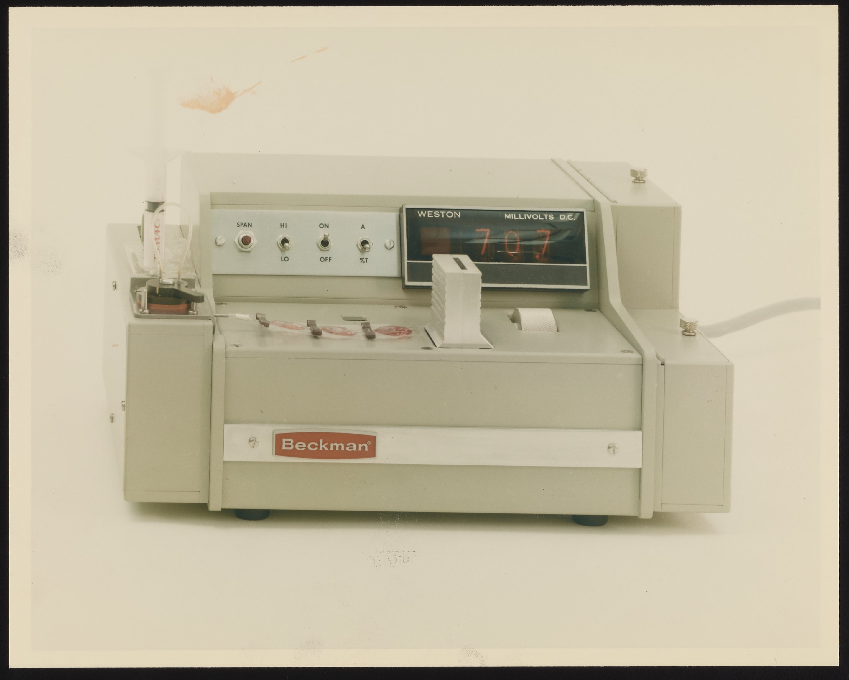 This instrument was created in 1968 by Beckman Instruments' Advanced Technology Operations (ATO) specifically for measuring the effect of space flight on calcium and creatinine levels in astronauts' urine. Colorimeters measure the absorbance of specific wavelengths of light, and are frequently used to measure concentrations of solute in a solution.