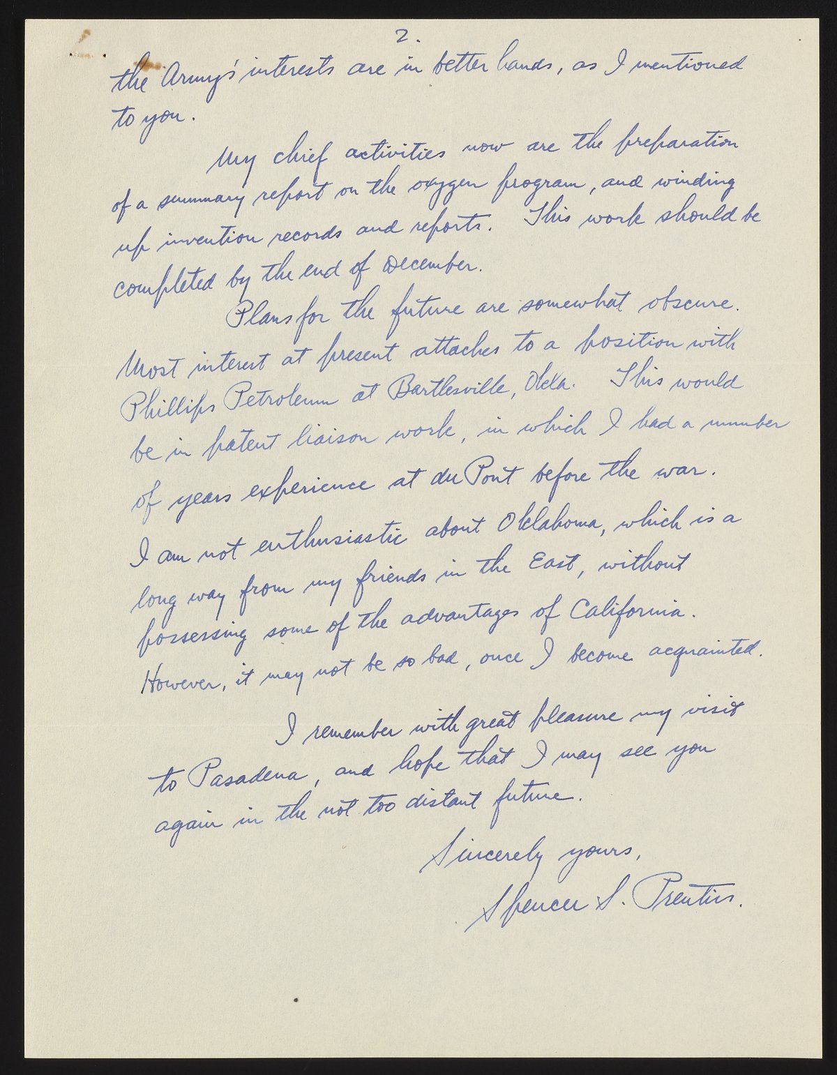 Small JPG1200 x 1543px — 279 KBFull-sized JPG2628 x 3380px — 1.2 MBOriginal fileTIFF — 2628 x 3380px — 25.5 MBIn this handwritten letter, Prentiss discusses reports on the oxygen meter contracts and the possibility of working for Phillips Petroleum, despite his lack of enthusiasm for relocating to Oklahoma.
