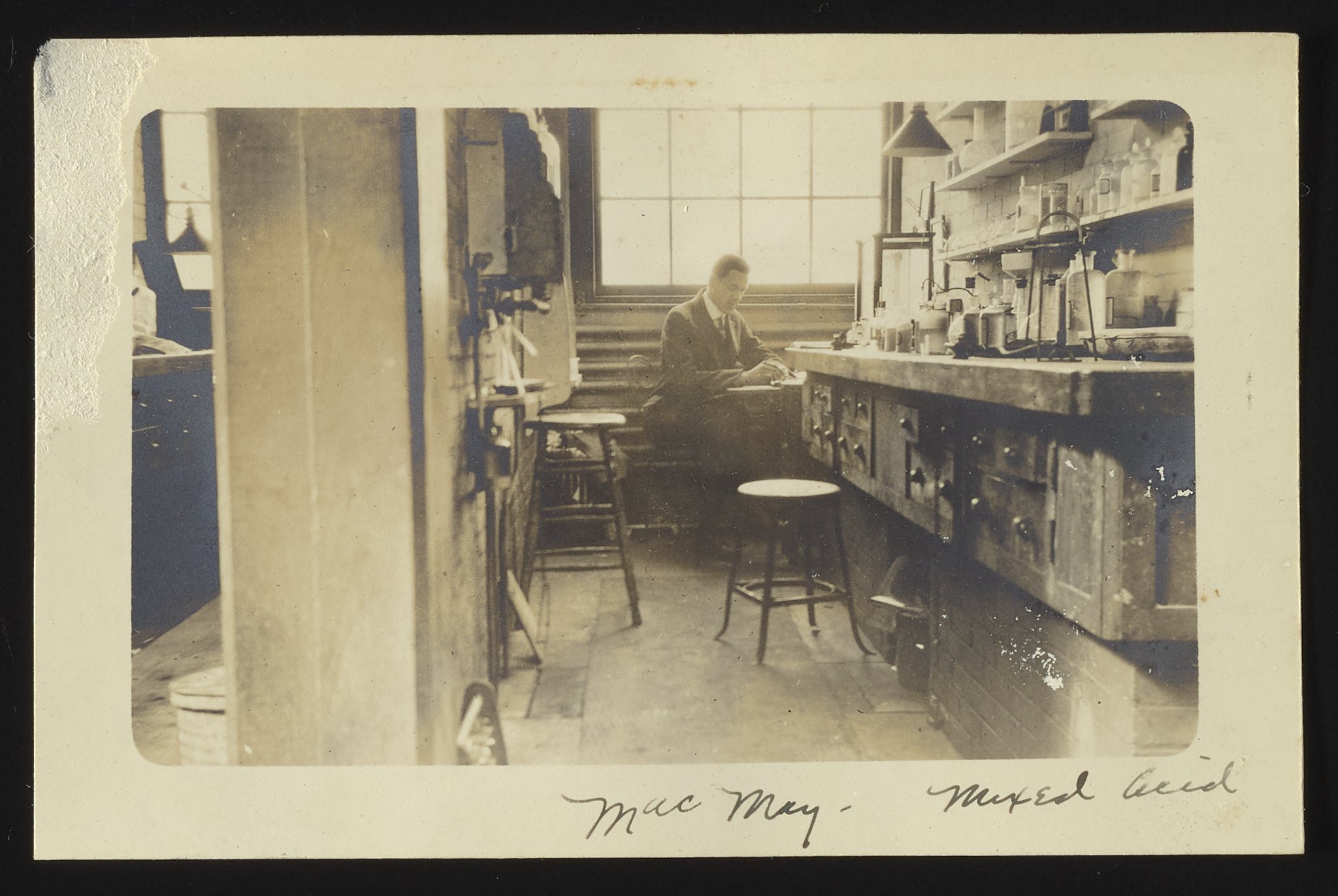 General view of a laboratory assistant, identified as "Mac May," posed at a work bench for mixed acid materials. Notably, the photograph is printed as a postcard, with space reserved on the verso for a message, mailing address, and postage. While the setting of this photograph is unidentified, inscriptions and supporting materials suggest that it many depict a laboratory associated with the U.S. Bureau of Standards. However, there is no contextual information directly linking this photo to the Bureau of Standards, which broadly conducted tests on a variety of physical materials, developed a range of technological standards, and supported the dissemination of scientific and technological information.