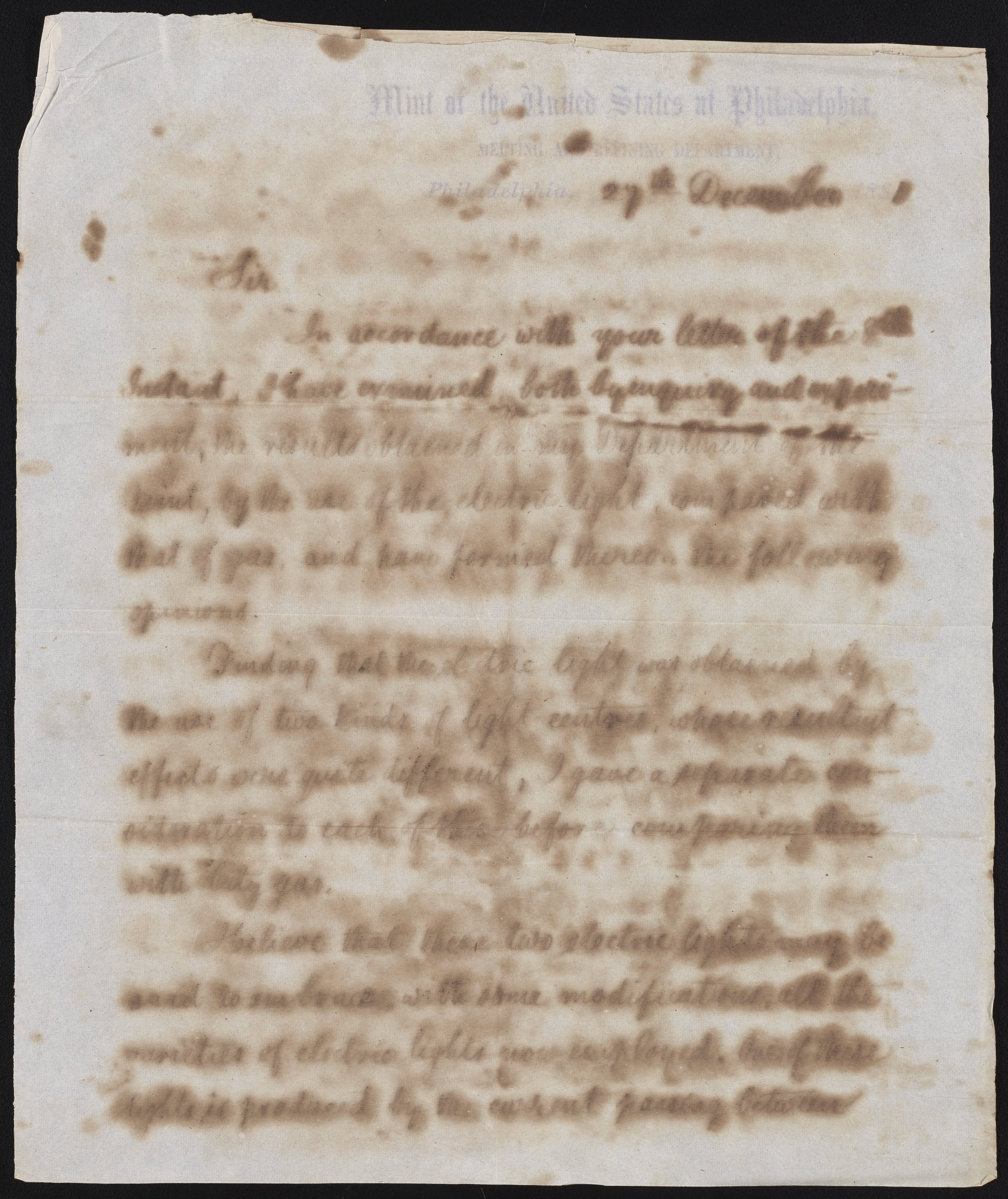 Small JPG1200 x 1428px — 245 KBLarge JPG2880 x 3426px — 1.6 MBFull-sized JPG4928 x 5863px — 4.5 MBOriginal fileTIFF — 4928 x 5863px — 82.7 MBJames Curtis Booth (1810-1888) writes to Archibald Loudon Snowden (1835-1912), Superintendent of the United States Mint at Philadelphia from 1879 to 1885, regarding a report on electric lights.
