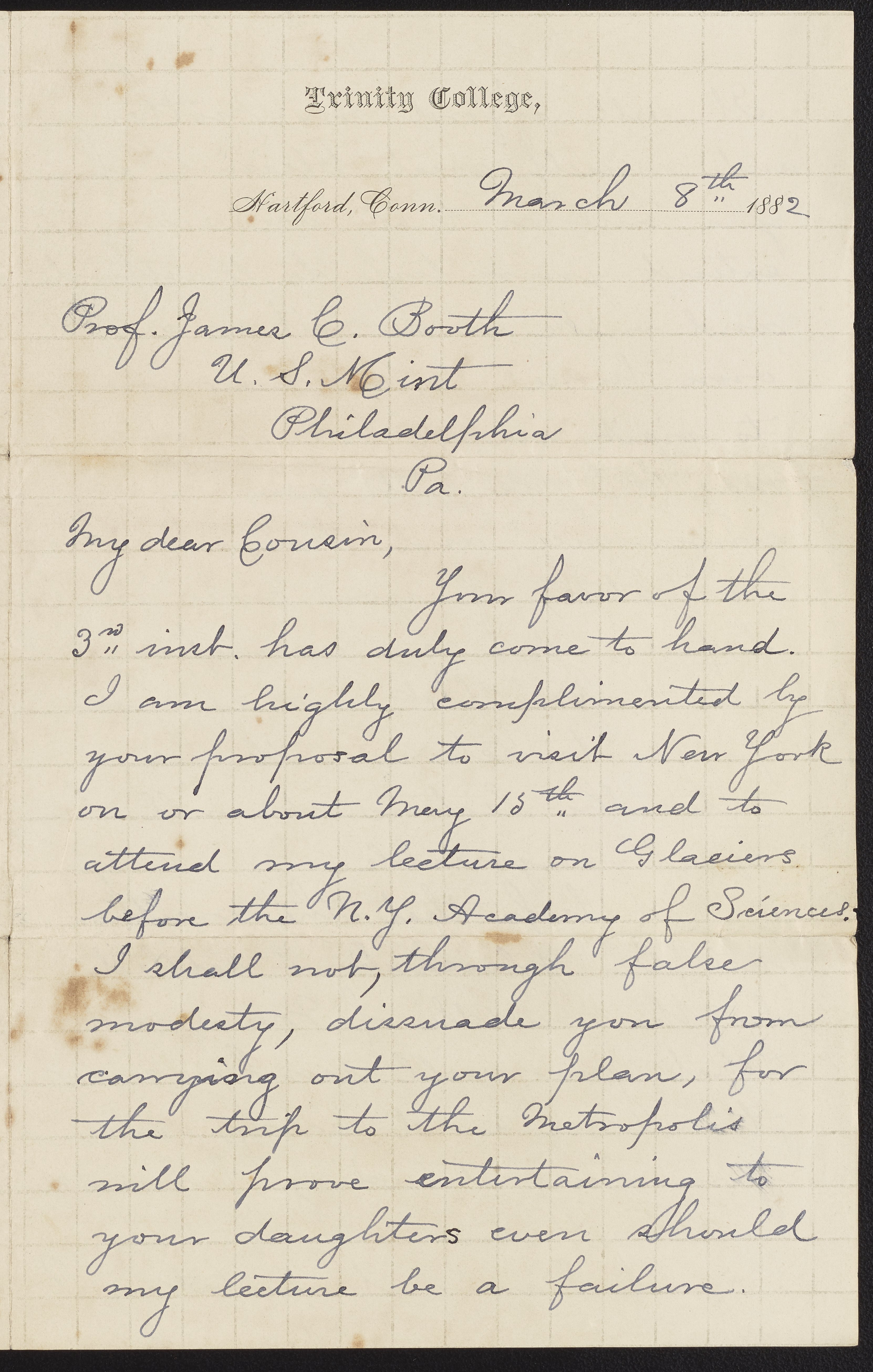 Small JPG1200 x 1886px — 349 KBLarge JPG2880 x 4526px — 1.8 MBFull-sized JPG3324 x 5224px — 2.3 MBOriginal fileTIFF — 3324 x 5224px — 49.7 MBHenry Carrington Bolton (1843-1903), an American chemist, professor of science at Trinity College, and relative of James Curtis Booth (1810-1888), invites Booth to attend a lecture by Bolton on glaciers and asks if Booth will act as judge in a student paper contest.