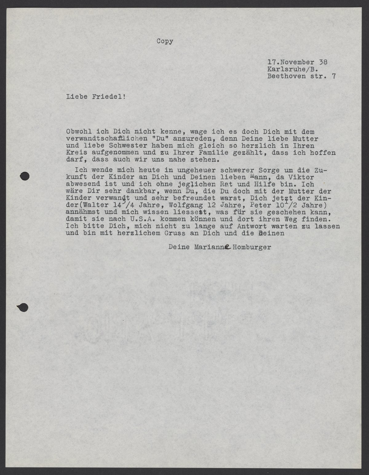 Marianne Homburger (1903-1986) asks Fridel Halstead to help her step-children Walter, Wolfgang, and Peter Homburger leave Germany. Marianne hopes that the children will go to the United States. In 1939, the children would travel to England via the Kinderstransport program.