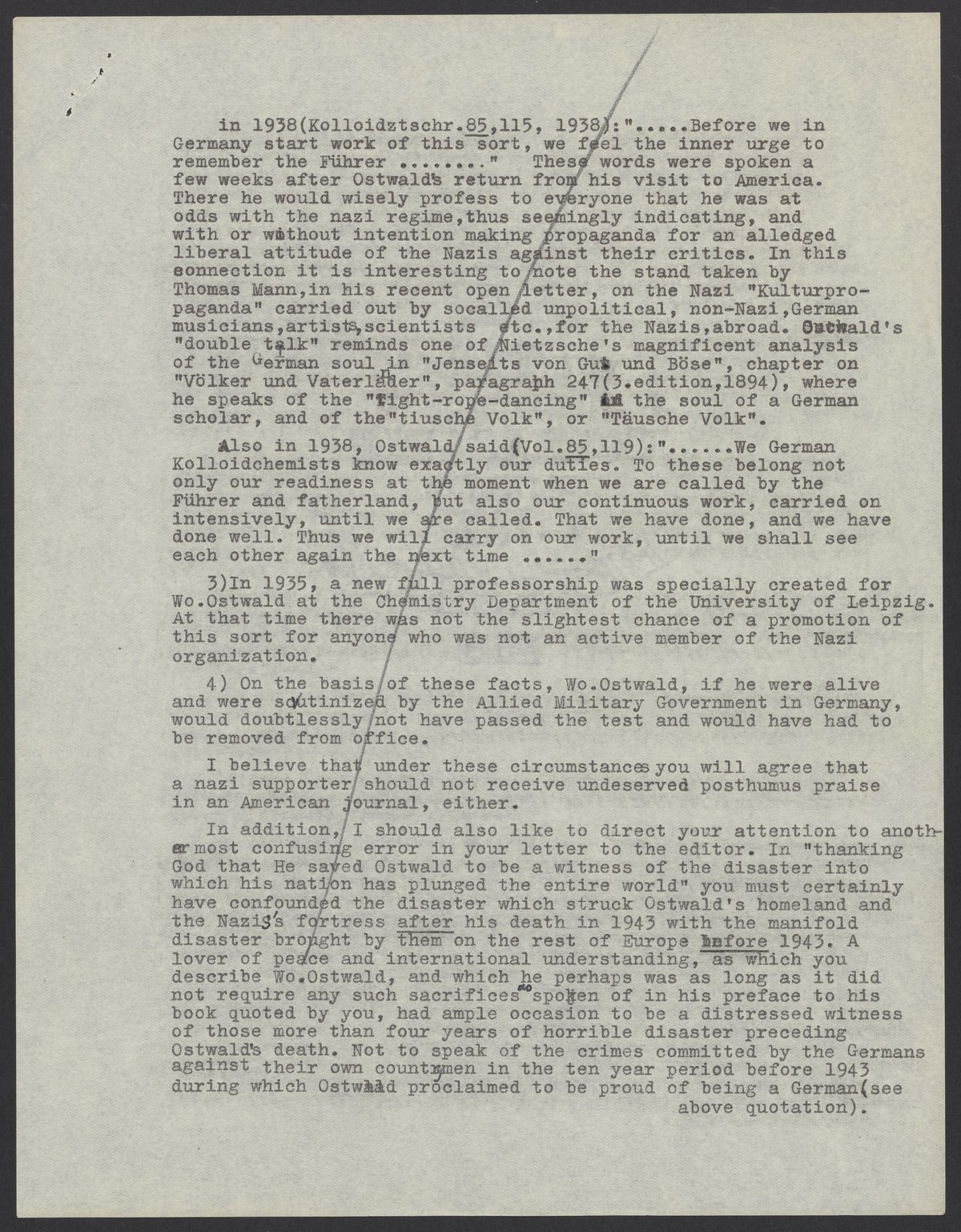 Small JPG1200 x 1539px — 345 KBLarge JPG2880 x 3693px — 2.1 MBFull-sized JPG5301 x 6797px — 6.8 MBOriginal fileTIFF — 5301 x 6797px — 103 MBMax Bredig (1902-1977) writes to Ernst A. Hauser (1896-1956) about Hauser's recent response to Wolfgang Ostwald's (1883–1943) obituary. Bredig posits that Ostwald either "behaved like or became a Nazi under the Hitler regime" and that this should have been noted in his obituary. Bredig includes evidence of this in his letter such as quotes from Ostwald's speeches and times he had been seen wearing a swastika.