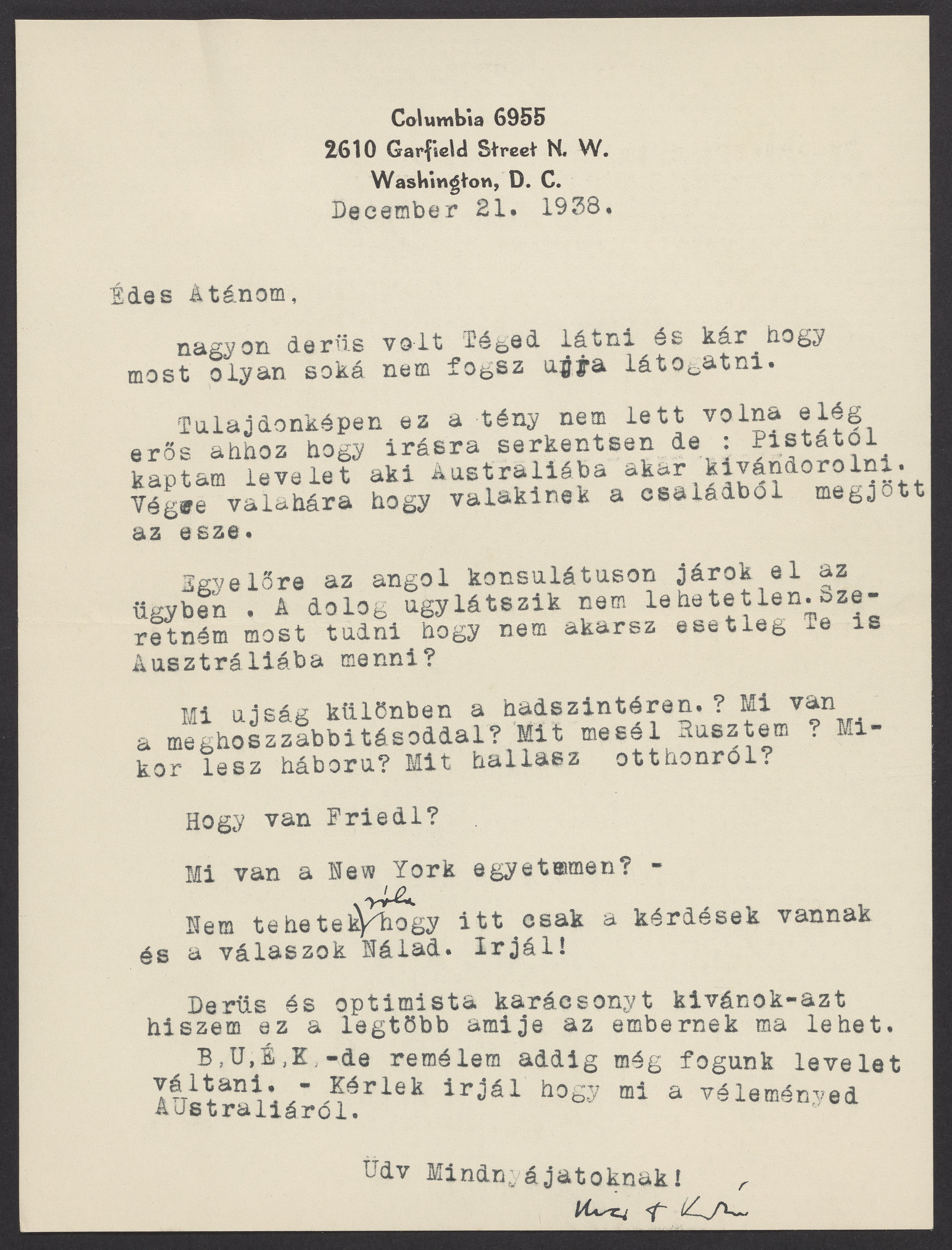 Letter to Gabor B. Levy from Mici Teller, December 21, 1938