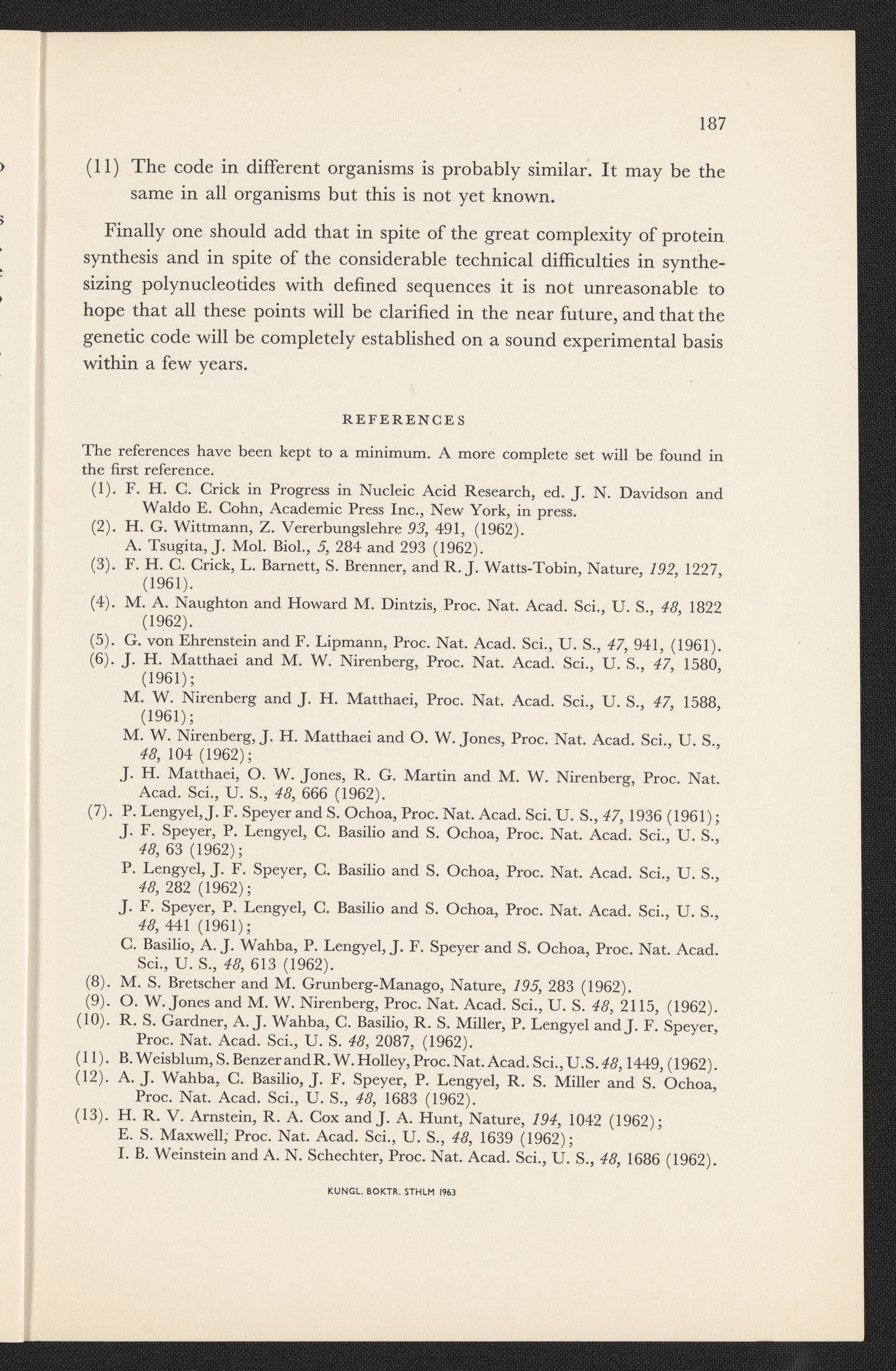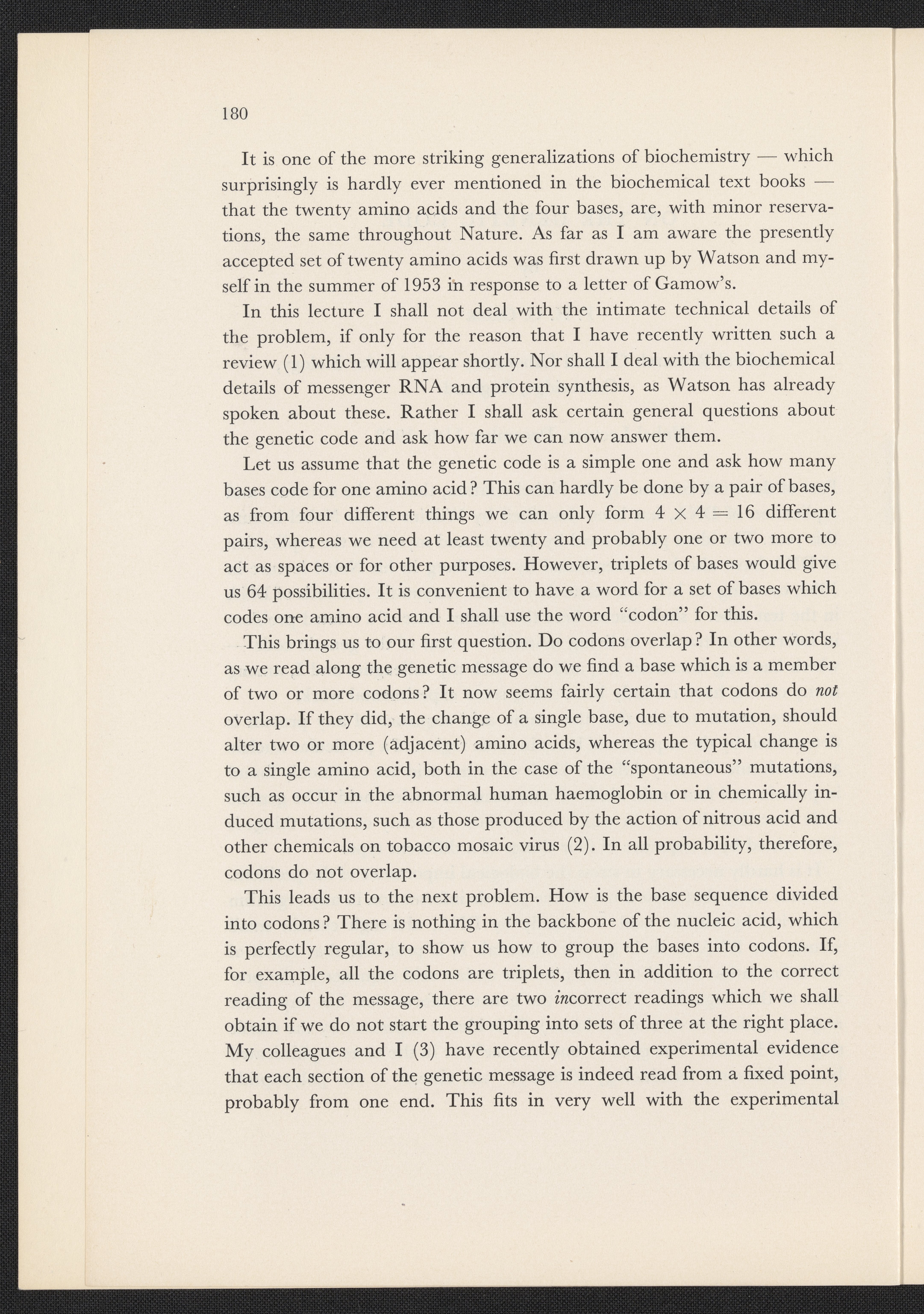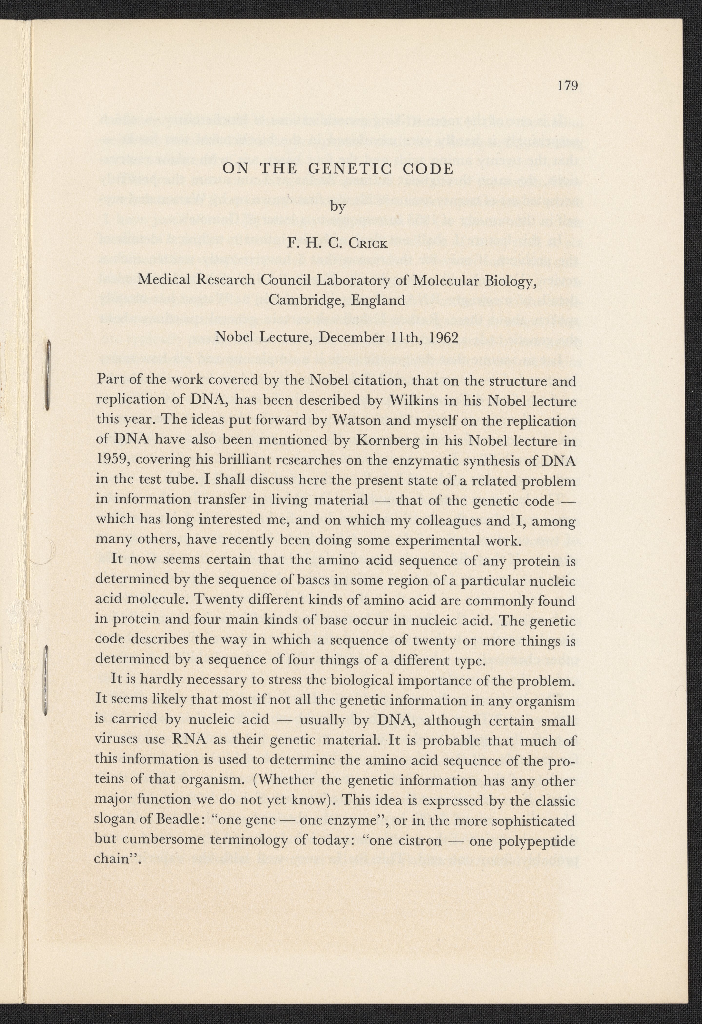 Crick, Francis. “Les Prix Nobel: On the Genetic Code by F. H. C. Crick,” 1962–1963. History of Molecular Biology Collection, Box 2, Folder 9. Science History Institute. Philadelphia. https://digital.sciencehistory.org/works/nfc7tf2.