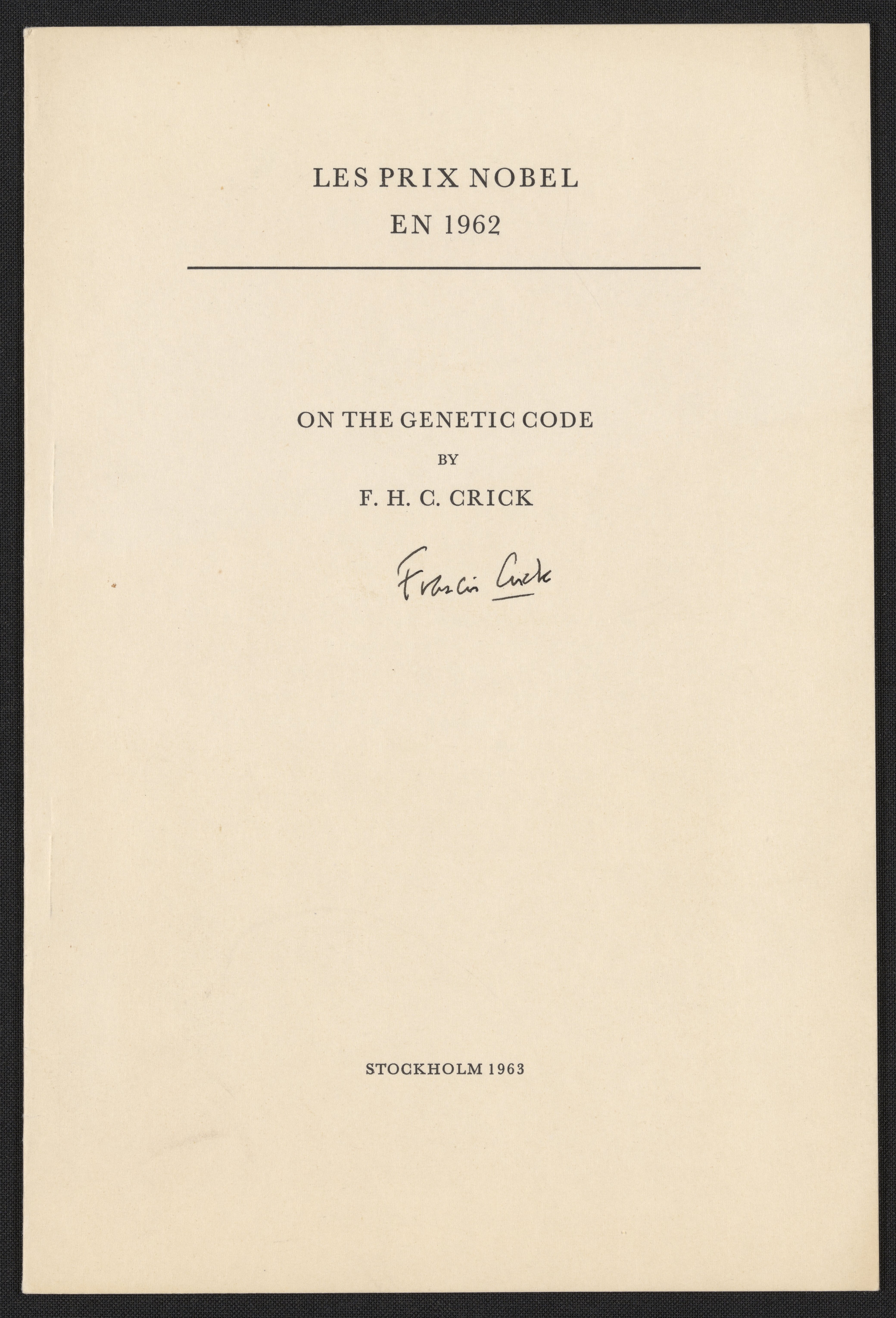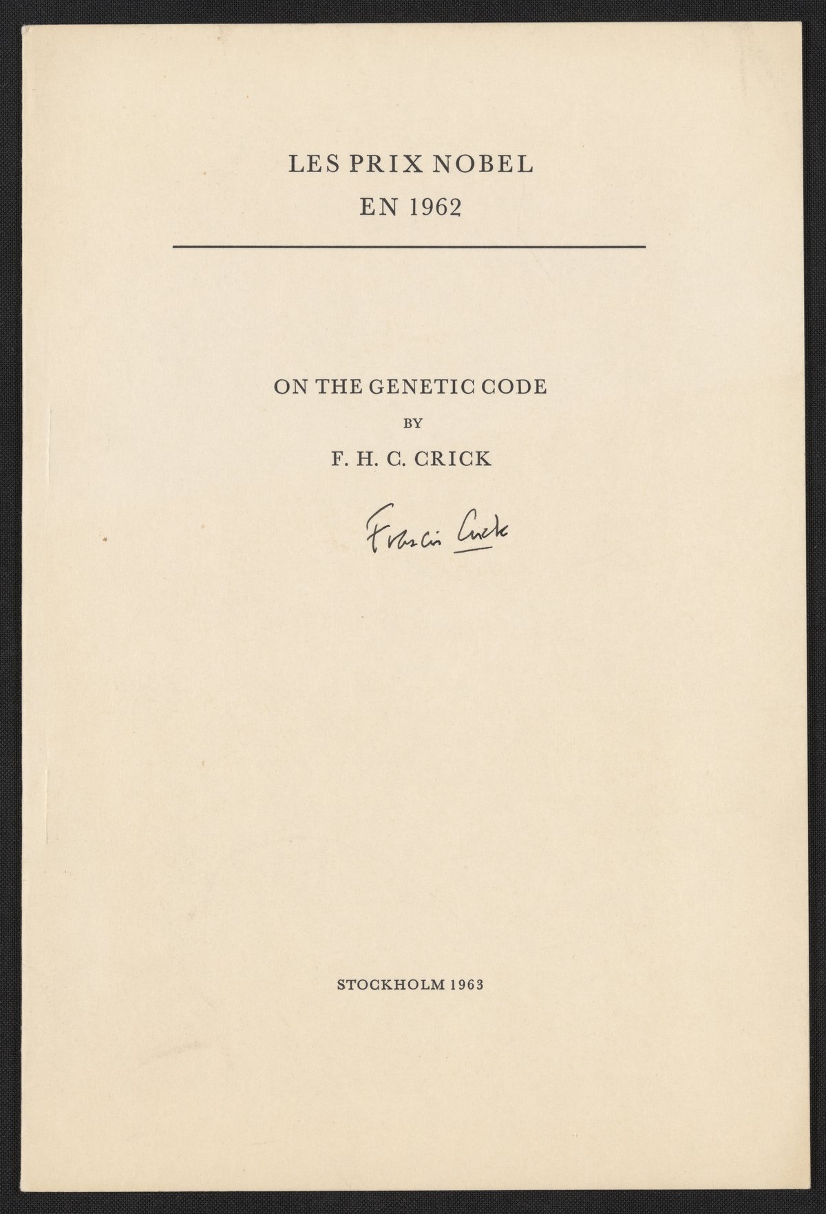 Autographed copy of Les Prix Nobel en 1962 containing the Nobel Lecture of Francis Crick (1916-2004) titled, "On the Genetic Code," December 11, 1962.