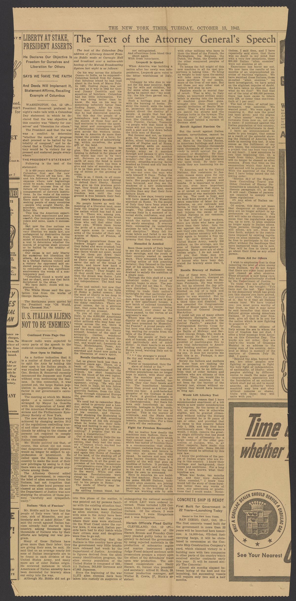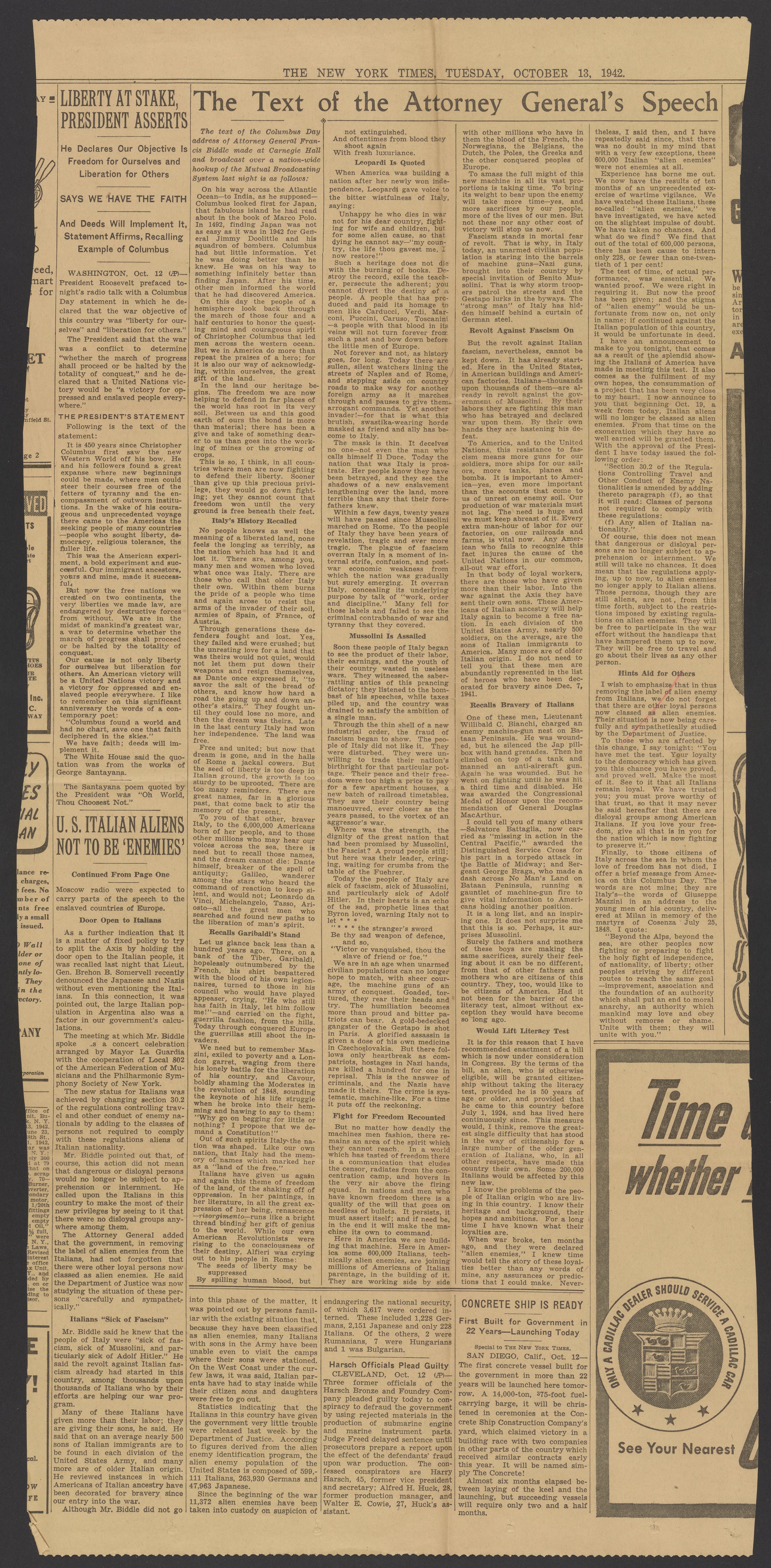 Small JPG1200 x 2439px — 912 KBLarge JPG2880 x 5853px — 4.3 MBFull-sized JPG7020 x 14267px — 21.5 MBOriginal fileTIFF — 7020 x 14267px — 287 MBClipping of Francis Beverley Biddle's (1886-1968) speech regarding Italian immigrants being 'Enemy Aliens'. During World War II Japanese, German, and Italian nationals were classified as enemy aliens in the United States. Enemy aliens were detained, denied citizenship, and deported. In 1942 Francis Biddle, the Attorney General of the United States, would no longer classify Italians as enemy aliens.