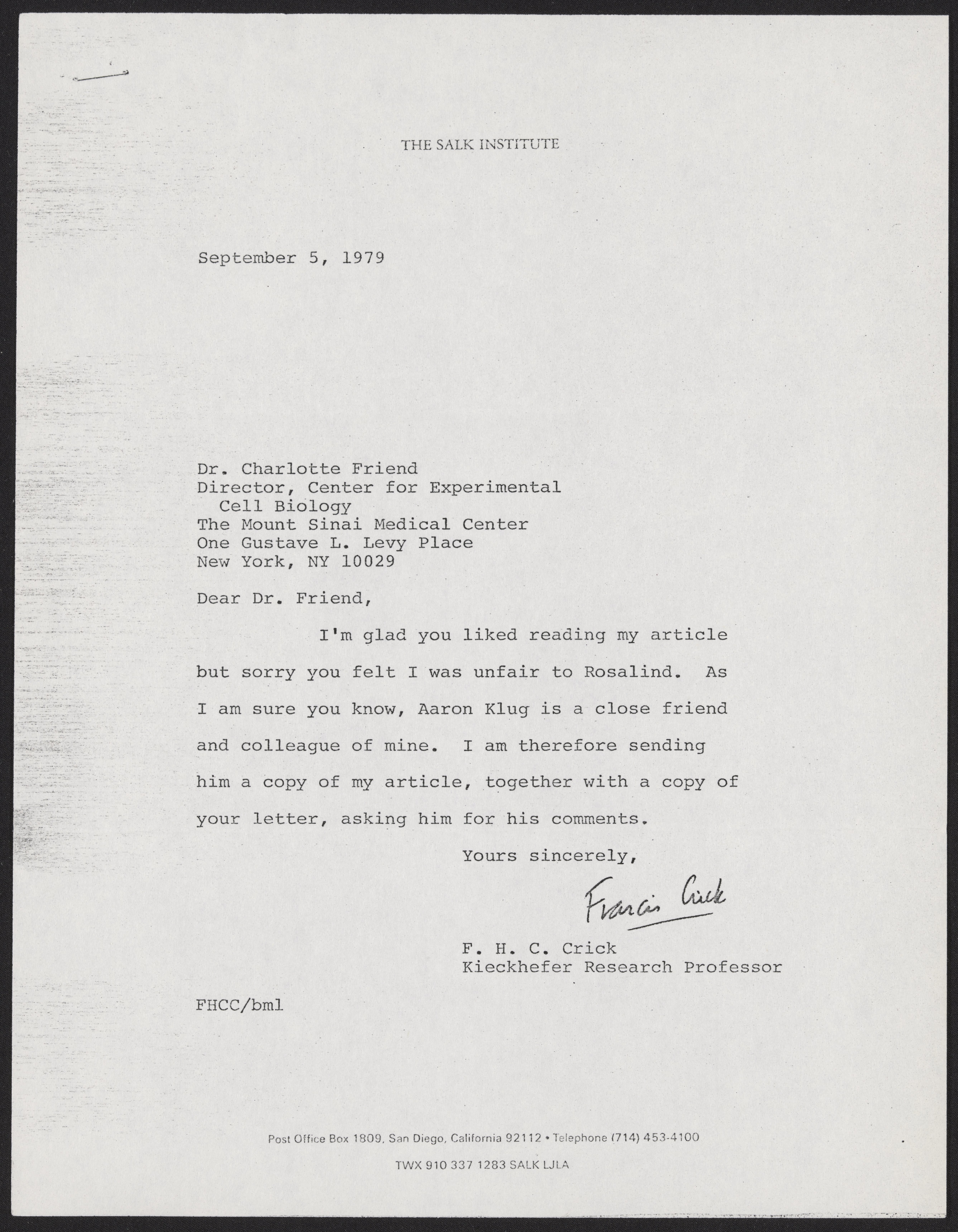 Letter from Francis Crick to Charlotte Friend, September 5, 1979