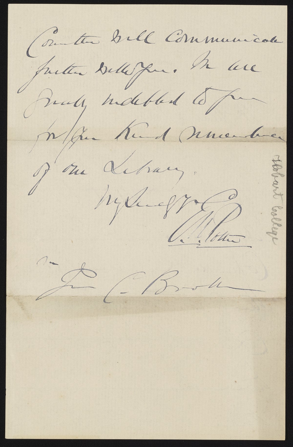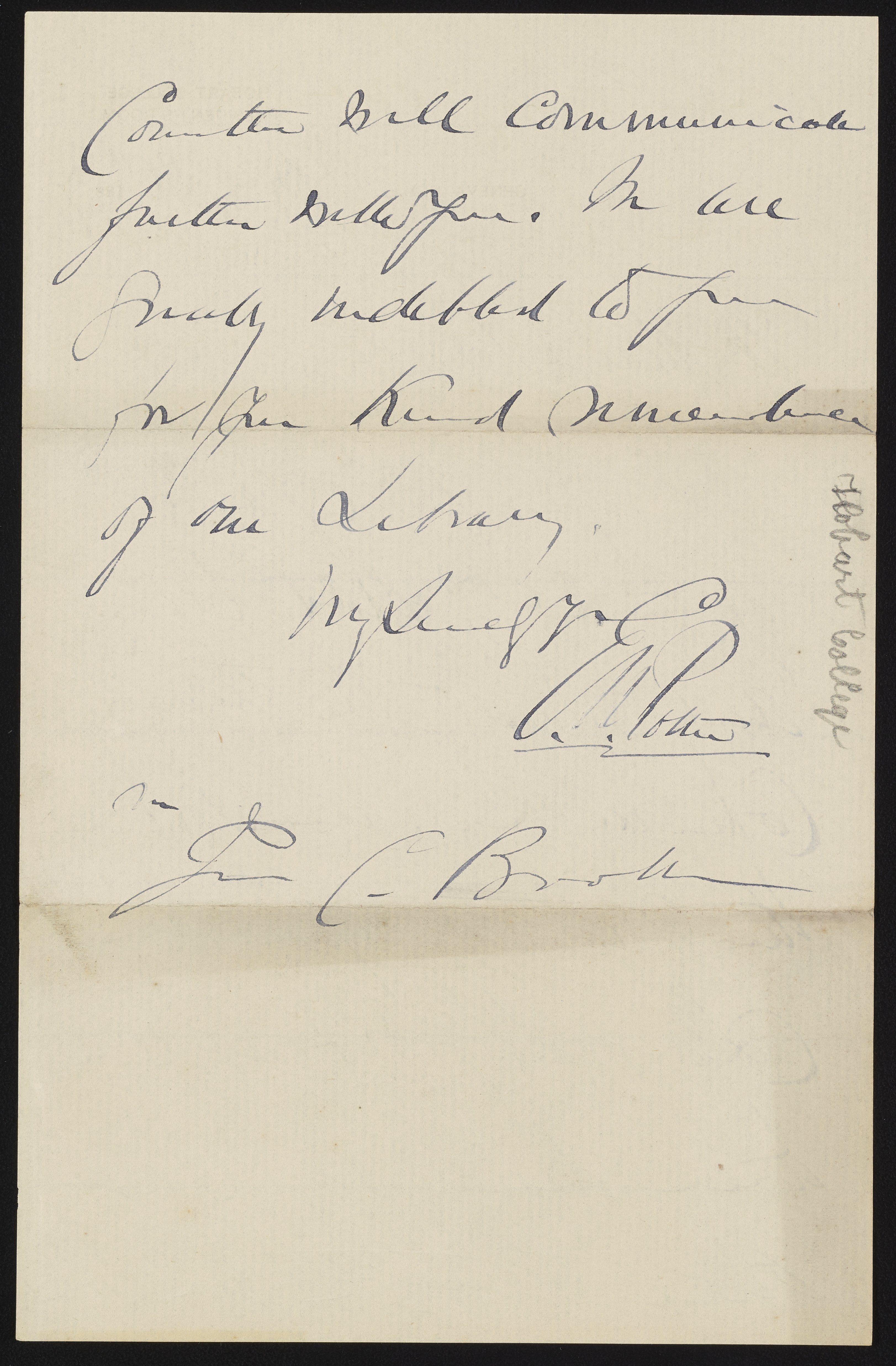Small JPG1200 x 1813px — 310 KBLarge JPG2880 x 4351px — 1.8 MBFull-sized JPG3262 x 4928px — 2.2 MBOriginal fileTIFF — 3262 x 4928px — 46.0 MBC.M. Potter writes James Curtis Booth (1810-1888) a thank-you note for a donation made to the Hobart College Library.