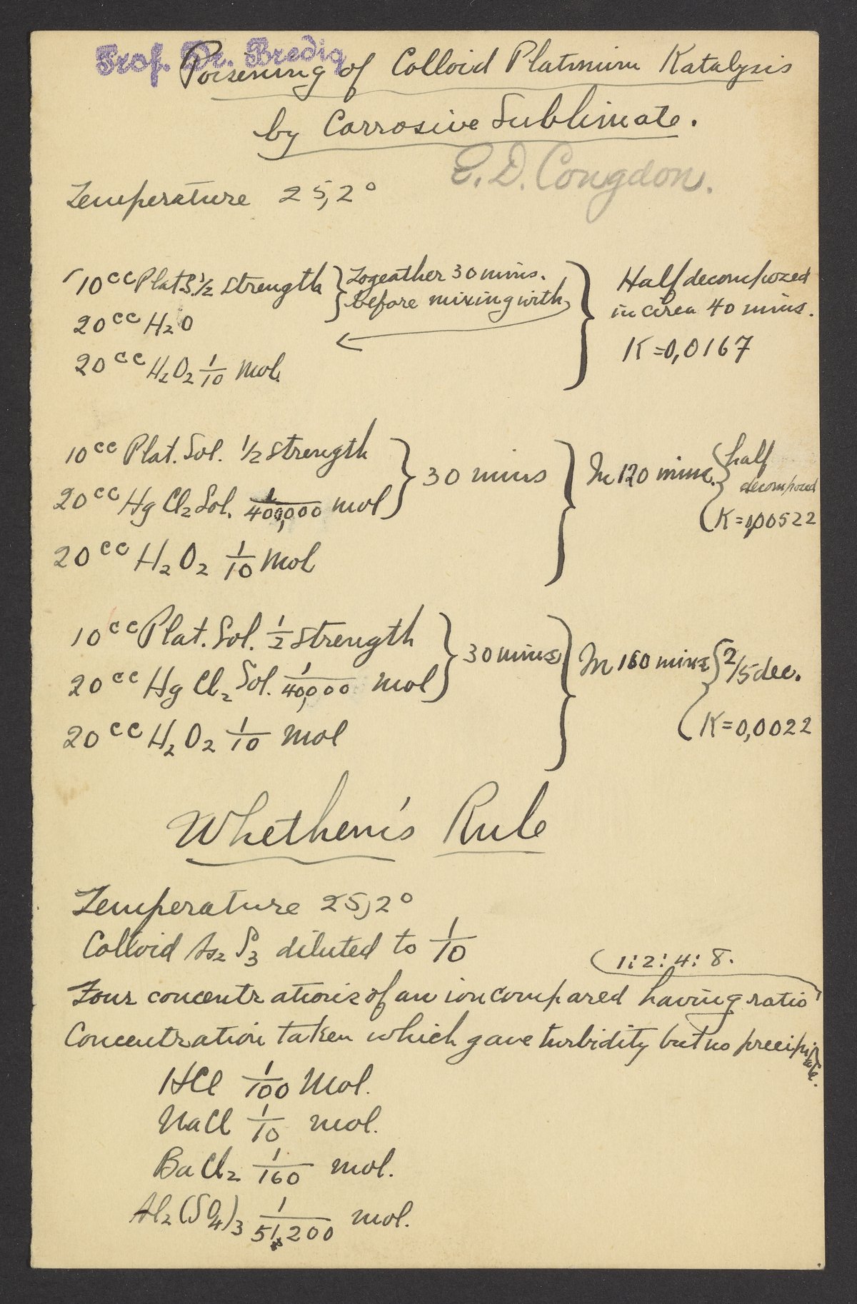 Bredig, Georg. “Colloid Platinum Katalysis Poisoning by Corrosive Sublimate,” circa 1909. Papers of Georg and Max Bredig, Box 3, Folder 20. Science History Institute. Philadelphia. https://digital.sciencehistory.org/works/njy2jkg.