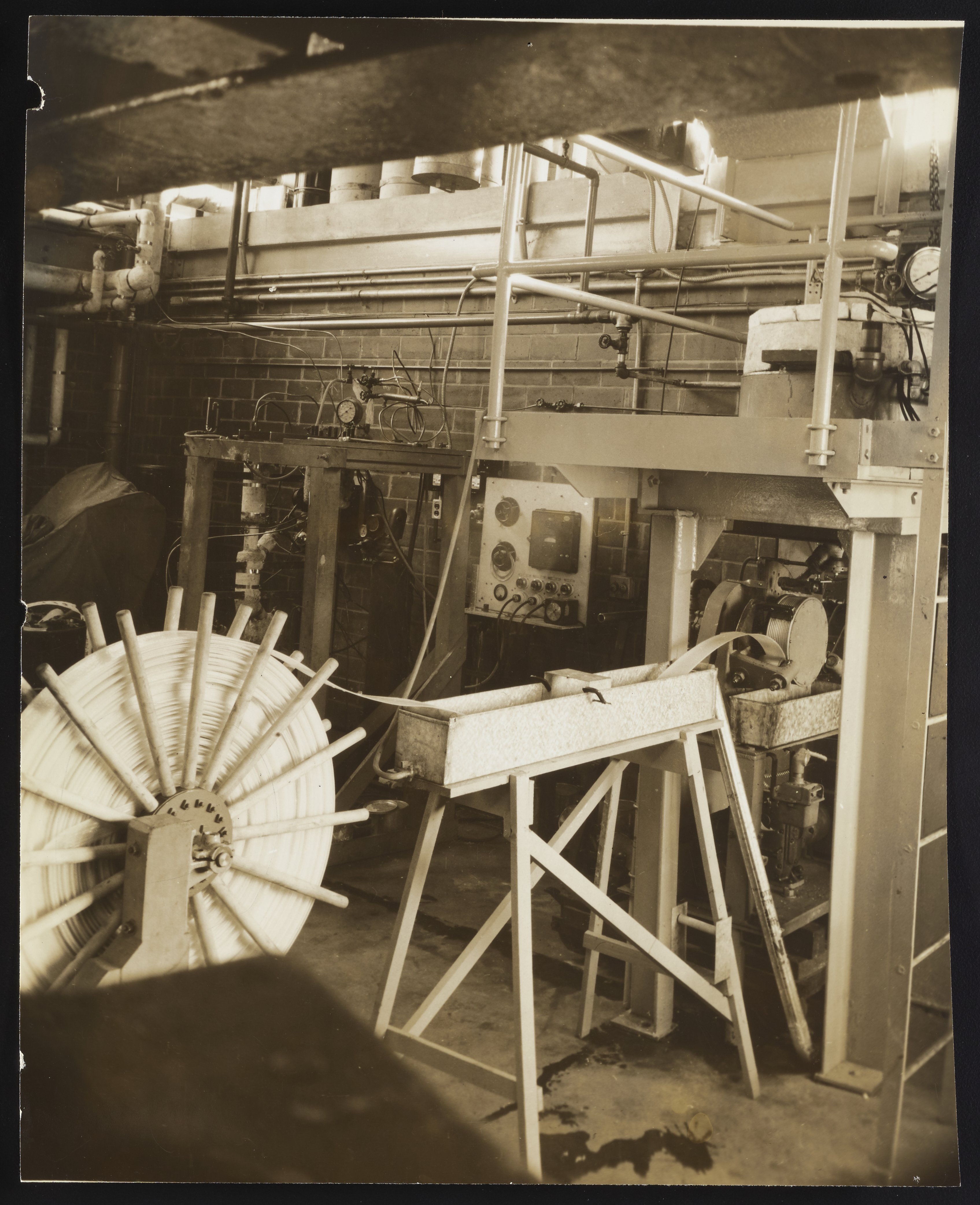 Close-up view of a 50-pound autoclave and polymer casting equipment used during the early stages of nylon production and research at the DuPont Experimental Station in Wilmington, Delaware. During production, a partially-evaporated nylon salt solution was fed into the autoclave and heated to 275 degrees centigrade under a pressure of 275 pounds per square inch in order to precipitate polymerization. Once polymerization occurred, additional water was bled off and the pressure was slowly reduced to atmospheric levels before the polymer was extruded. As visible on the left-hand side of the photograph, the hot polymer ribbon was extruded and wound onto a reel before being broken into nylon chips for spinning.