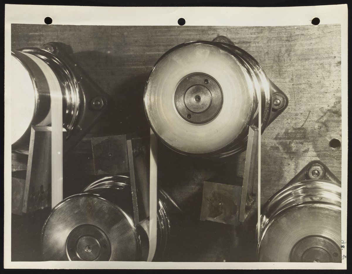 Close-up view of the wrap scraper blade on a drawing machine used at the DuPont plant in Seaford, Delaware during the early stages of nylon production and research.