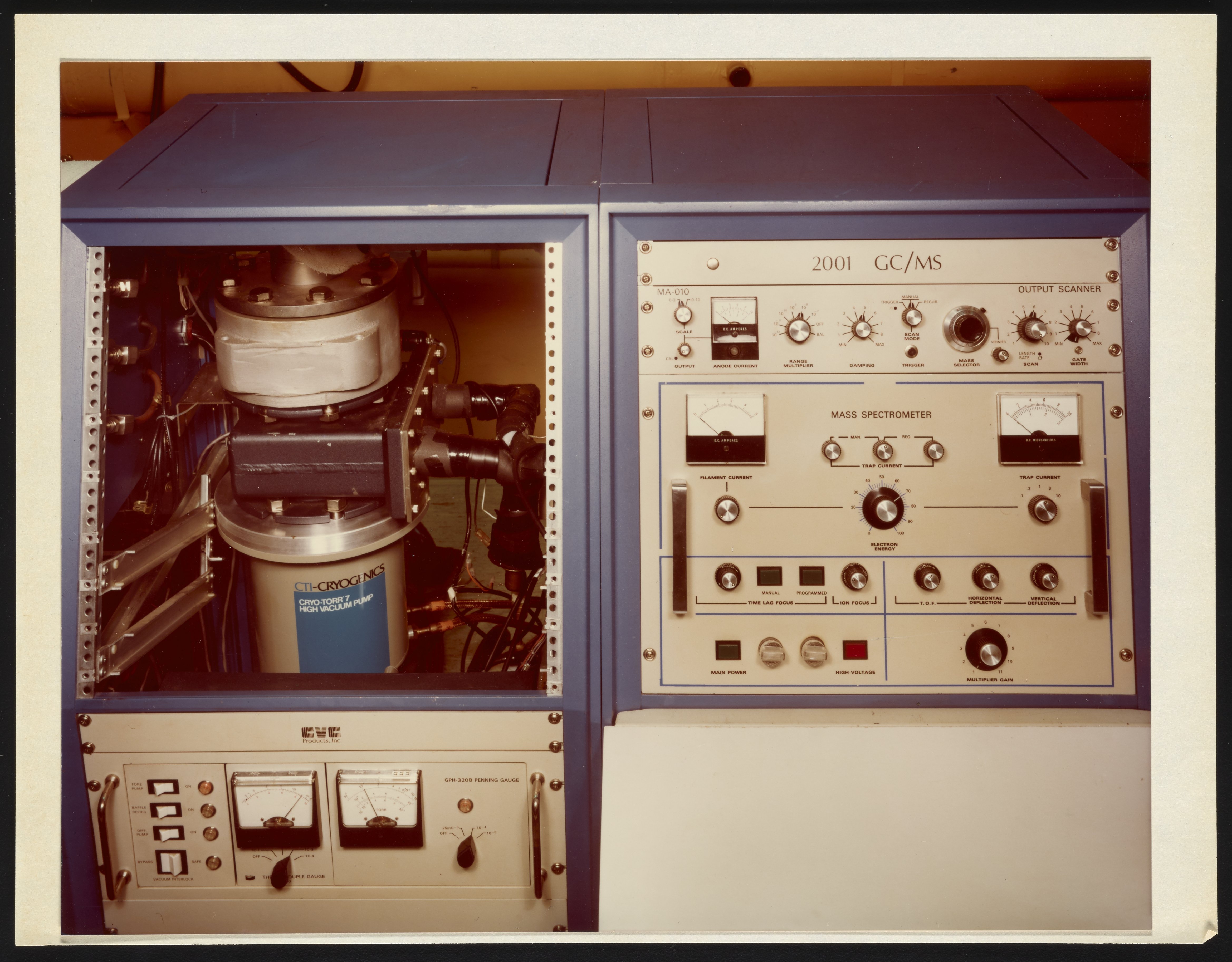 Close-up view of a portion of a Consolidated Vacuum Corporation Model 2001 Masschromatograph, with view of the exposed interior showing a CTI-Cryogenics high vacuum pump. Also known as CVC Products Inc., Consolidated Vacuum Corporation operated as a subsidiary of the Bendix Corporation prior to Allied Signal's takeover of Bendix in 1983. The Masschromatograph 2001 offered the qualitative and quantitative capabilities of combined gas chromatography and mass spectrometry for a variety of laboratory applications, including forensics, toxicology, and food flavoring.