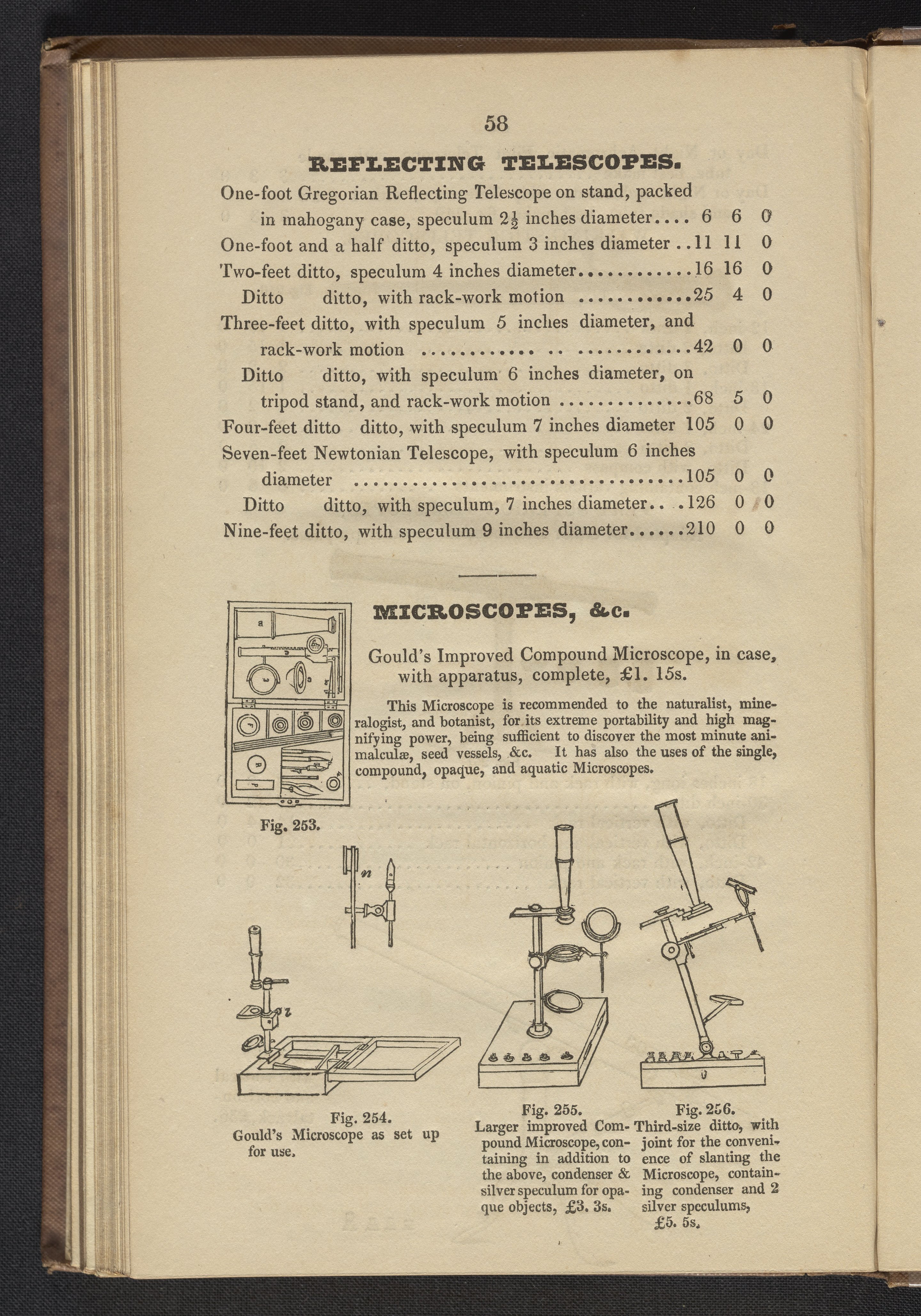 Palmer, Edward. “Figures 253-256. Gould's Improved Compound Microscope.” In Palmer's New Catalogue, with Three Hundred Engravings of Apparatus, Illustrative of Chemistry, Pneumatics, Frictional and Voltaic Electricity, Electro Magnetism, Optics, &c. London, England: William Gilbert, 1840. https://digital.sciencehistory.org/works/nk61zfx.