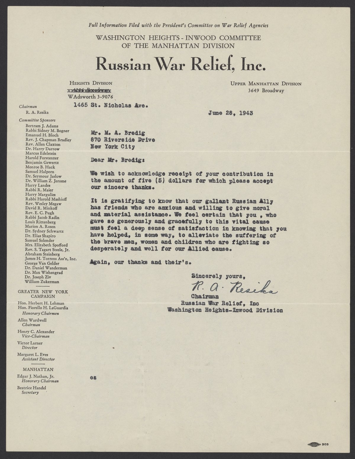 Letter from the Russian War Relief to Max Bredig, June 28, 1943