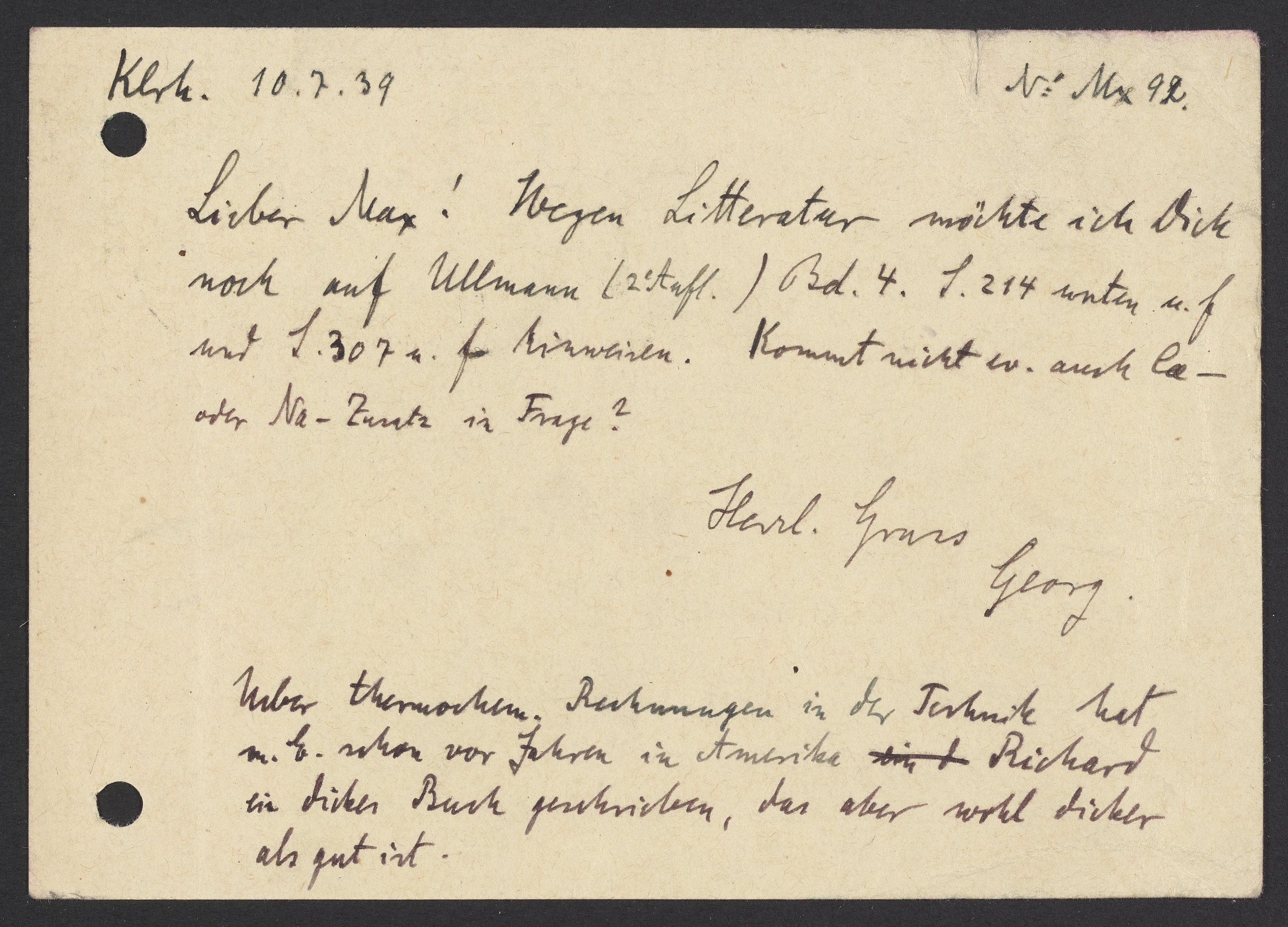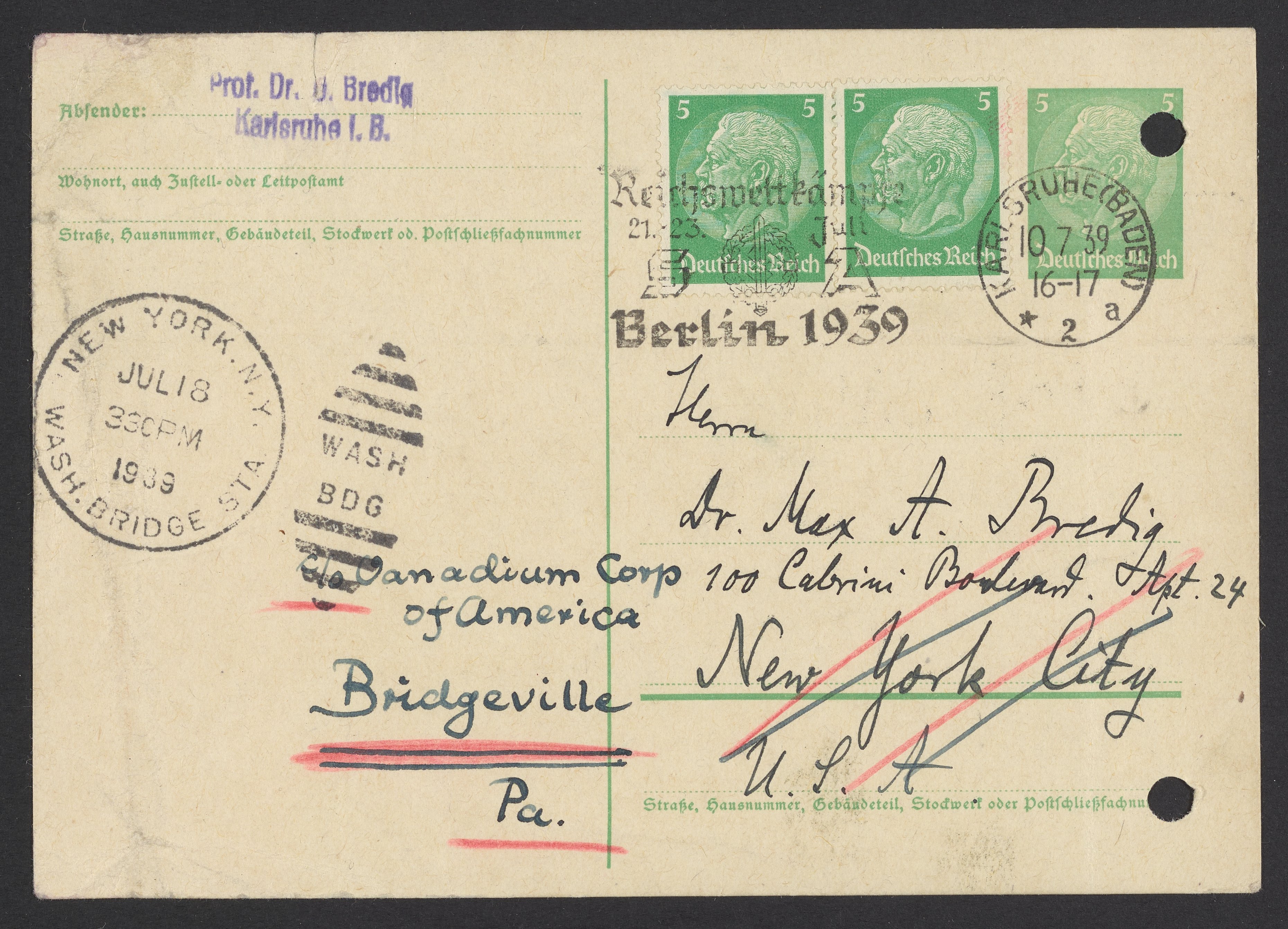 Postcard from Georg Bredig to Max Bredig, July 10, 1939