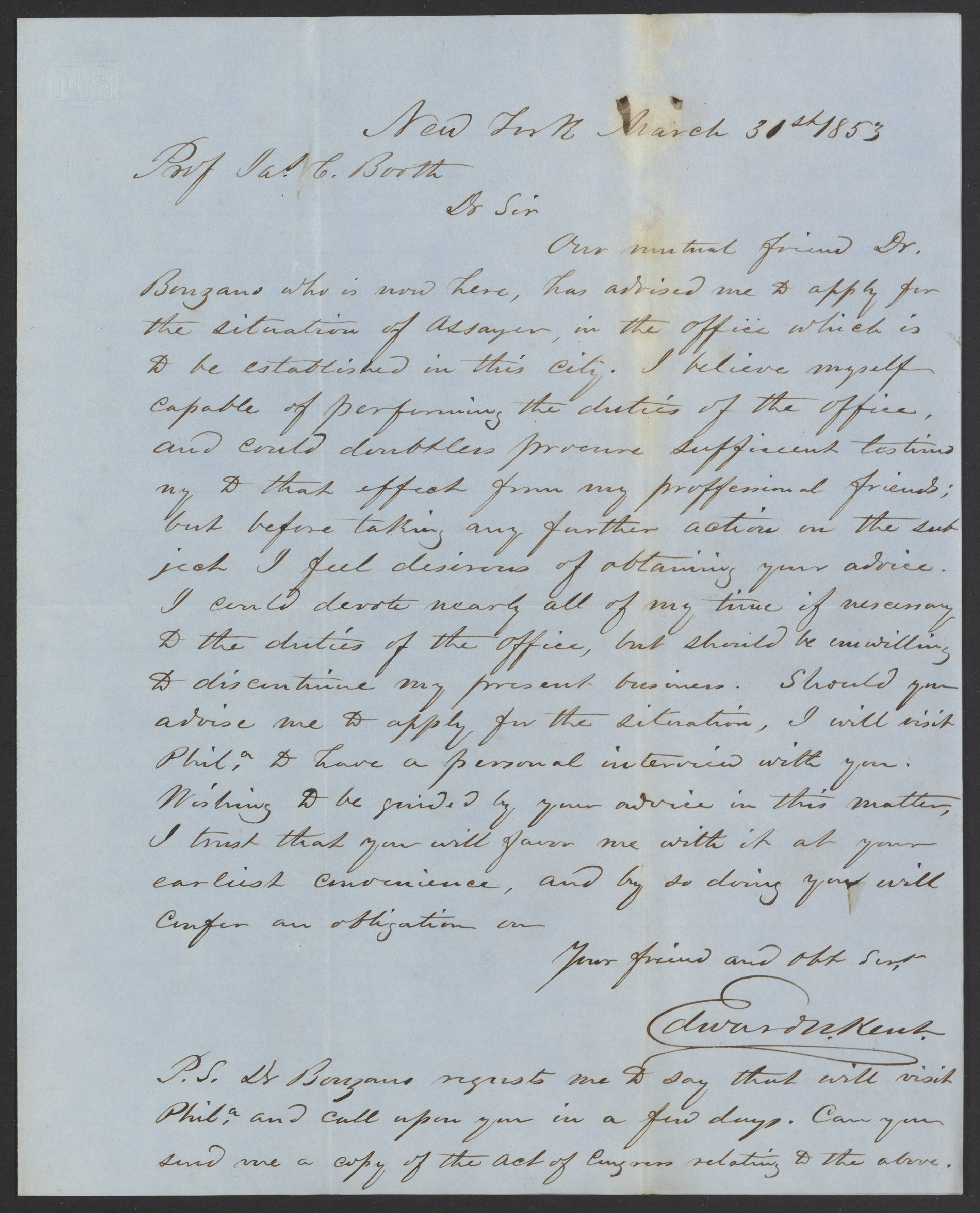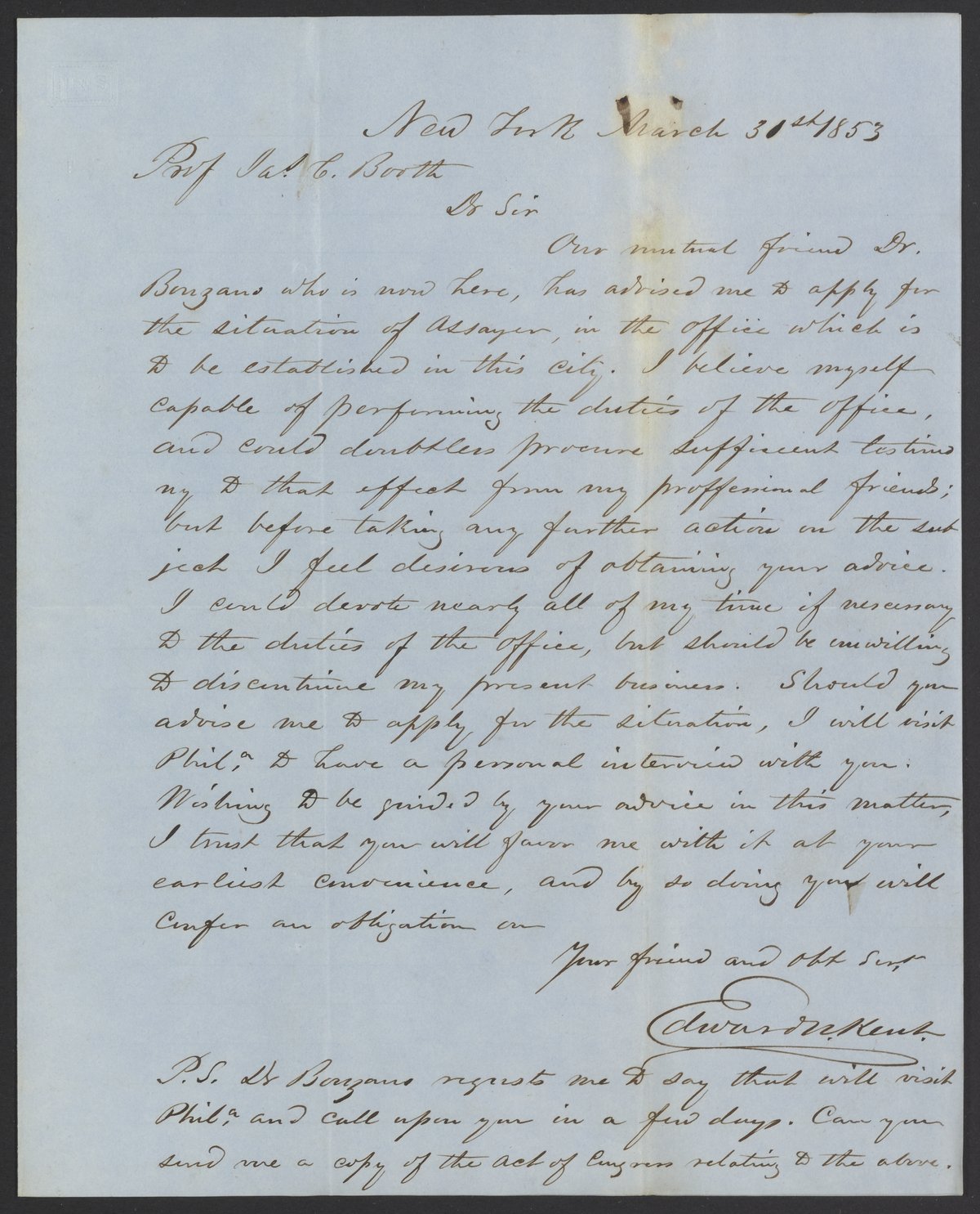 Letter from Edward N. Kent to James Curtis Booth, March 31, 1853
