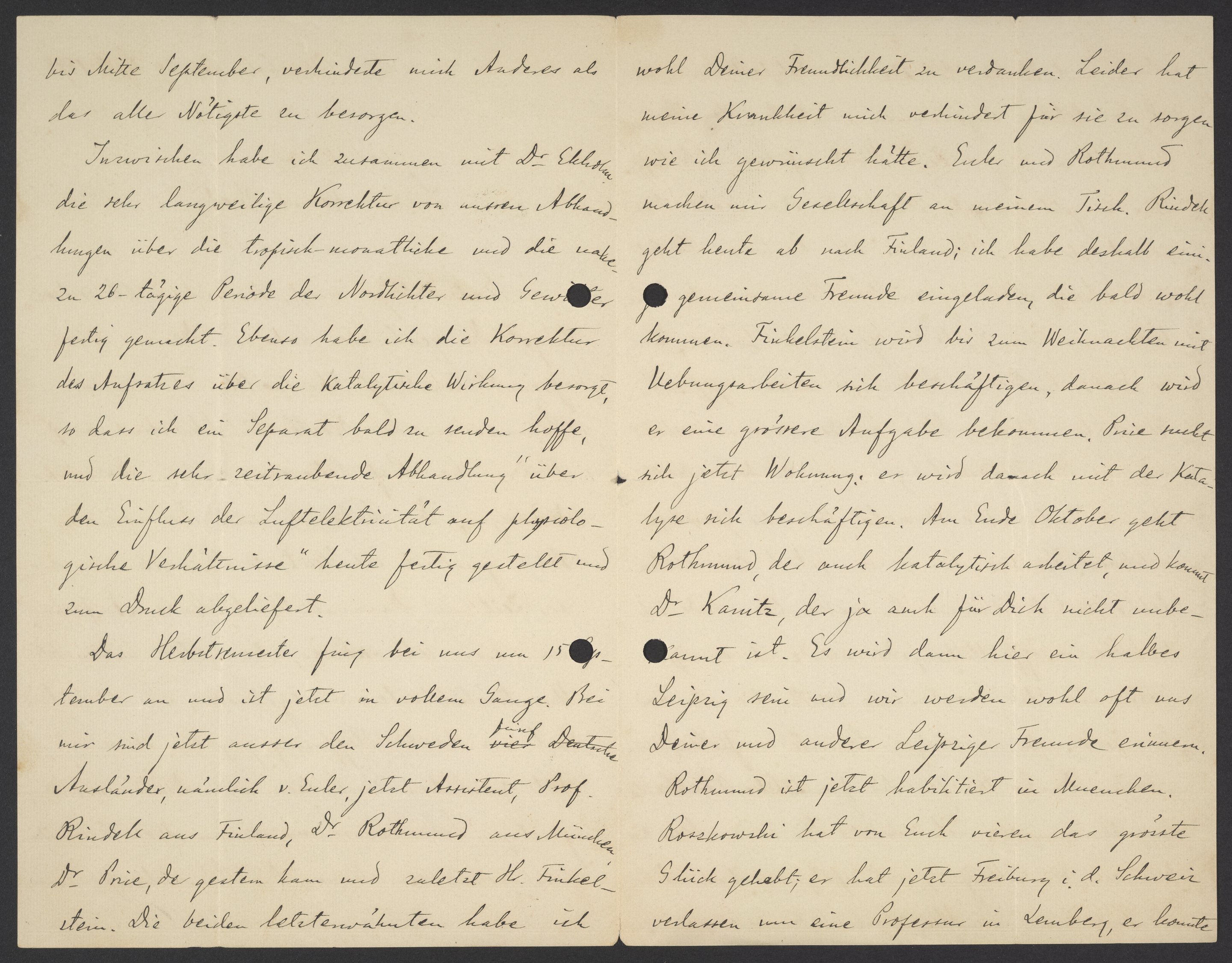 wohl Deiner Freundlichkeit zu verdanken. Leider hat meine Krankheit mich verhindert für sie zu sorgen wie gewünscht hätte. Euler und Rothmund machen mir Gesellschaft an meinem Tisch. Rindell geht heute ab nach Finland; ich habe deshalb einige gemeinsame Freunde eingeladen, die bald wohl kommen. Finkelstein wird bis zum Weihnachten mit Übungsarbeiten sich beschäftigen, danach wird er eine grössere Aufgabe bekommen. Price such sich jetzt Wohnung: er wird danach mit der Katalyse sich beschäftigen. Am Ende Oktober geht Rothmund, der auch katalytisch arbeitet, und kommt Dr. Kamitz, ja auch für Dich nicht unbekannt ist. Es wird dann hier ein halbes Leipzig sein und wir werden wohl oft uns Deiner und anderer Leipziger Freunde erinnern.