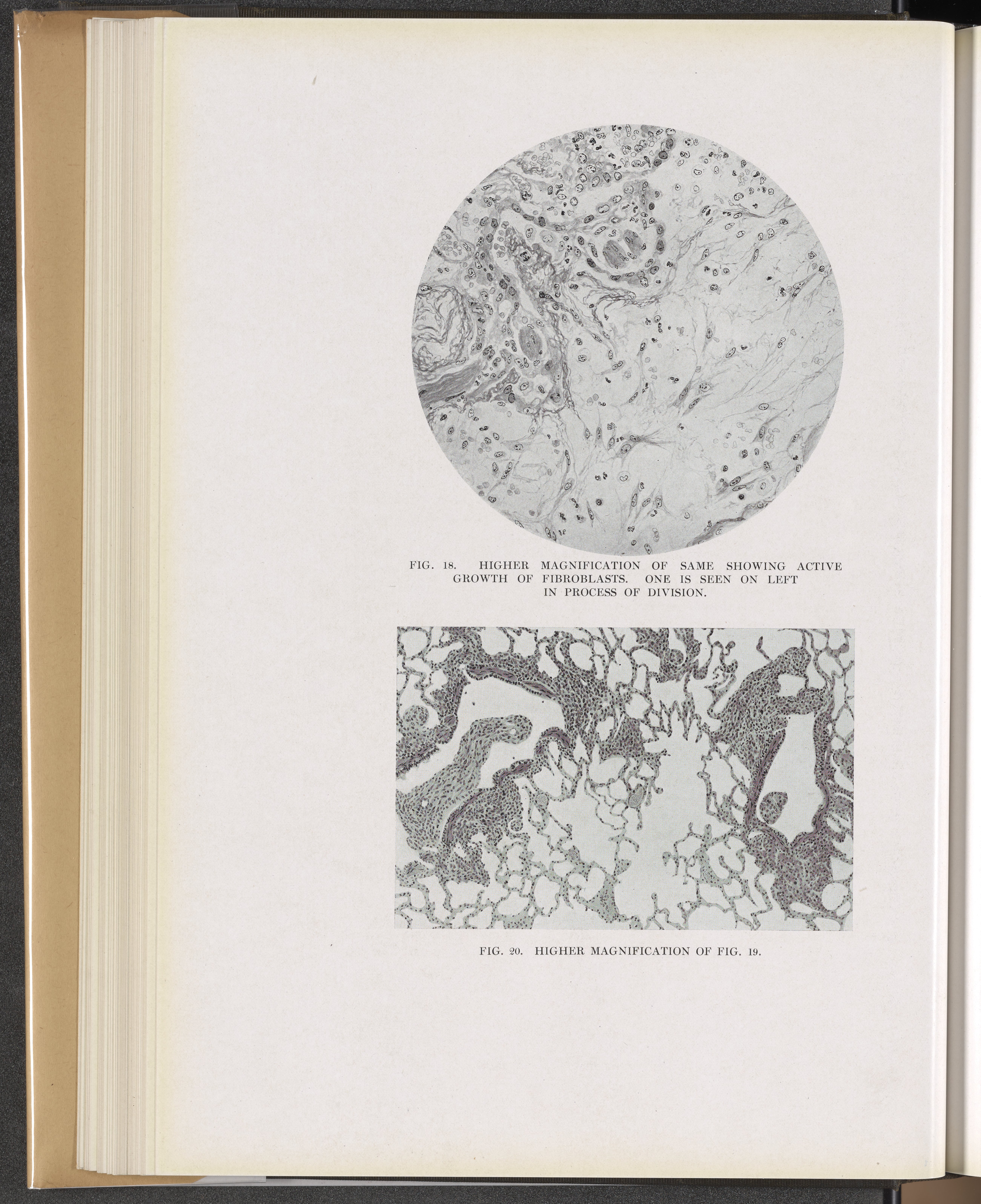 Winternitz, M. C. (Milton C.). “Fig. 18: Higher Magnification of Same Showing Active Growth of Fibroblasts. Fig. 20: Higher Magnification of Fig. 19.” Collected Studies on the Pathology of War Gas Poisoning. New Haven, Connecticut: Yale University Press, 1920. https://digital.sciencehistory.org/works/np193940q.