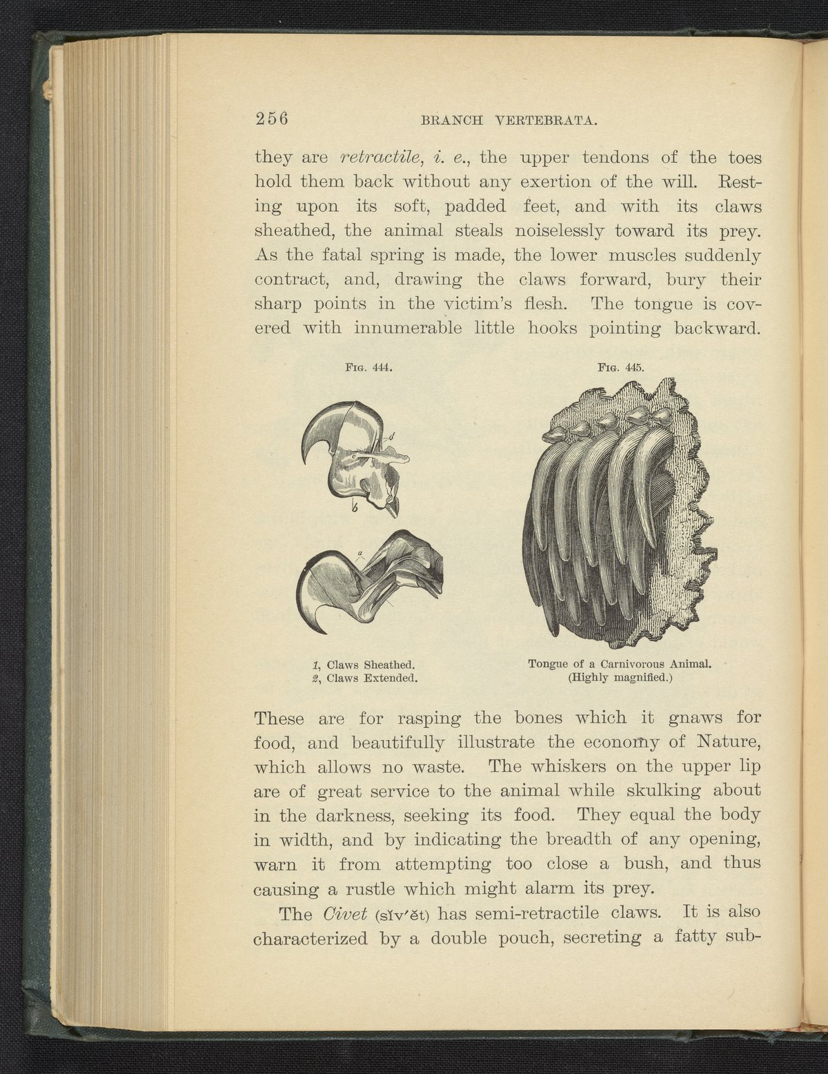 Steele, Joel Dorman, and Jenks, J. W. P. (John Whipple Potter). “Figure 444. Claws Sheathed. Claws Extended. Figure 445. Tongue of a Carnivorous Animal .” Popular Zoology. New York, New York: Chautauqua Press, 1887. https://digital.sciencehistory.org/works/nrvr6jg.
