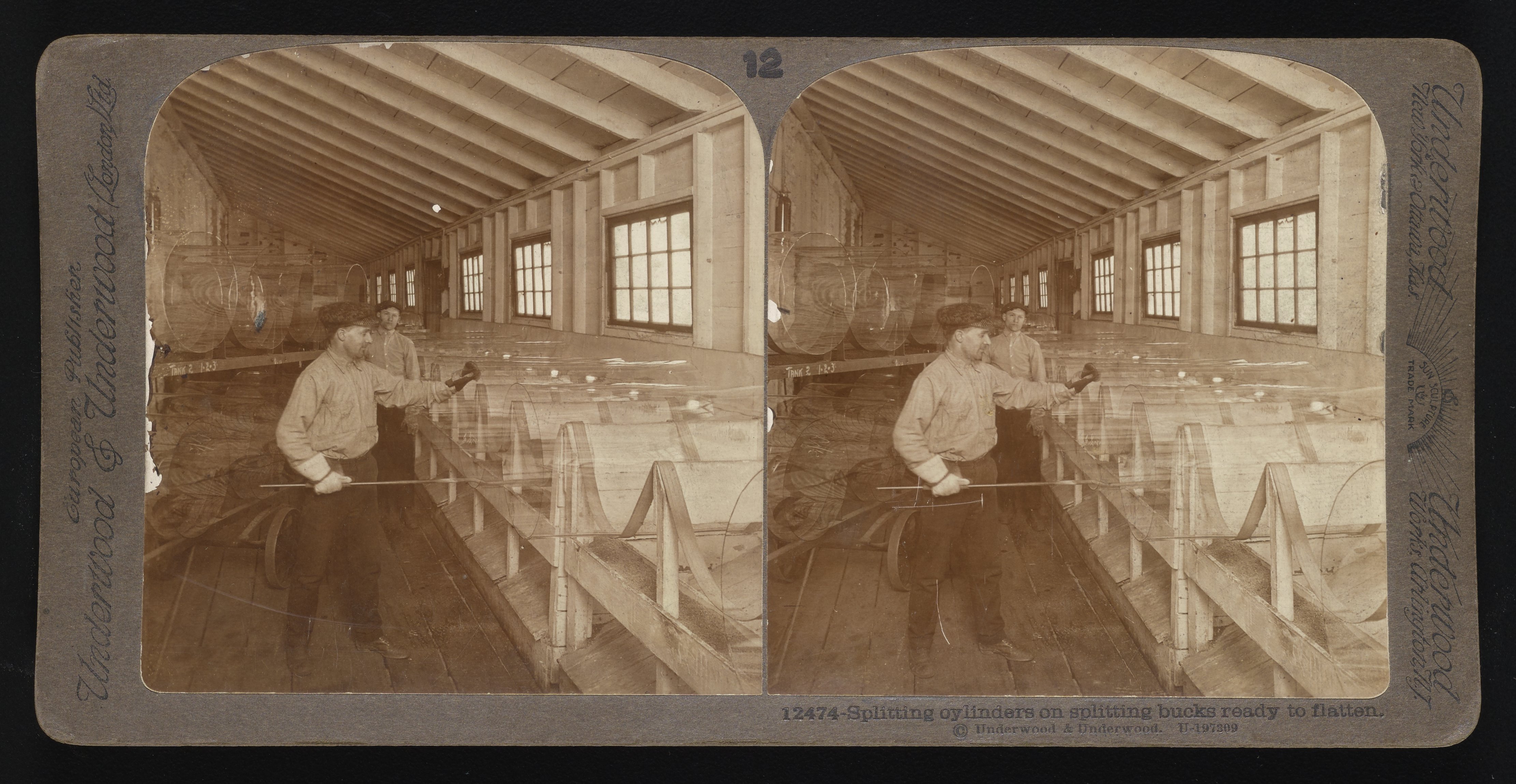 “Splitting Cylinders on Splitting Bucks Ready to Flatten.” Underwood & Underwood, n.d. Underwood & Underwood Stereographs of Manufacturing Industries. Science History Institute. Philadelphia. https://digital.sciencehistory.org/works/ns0646018.