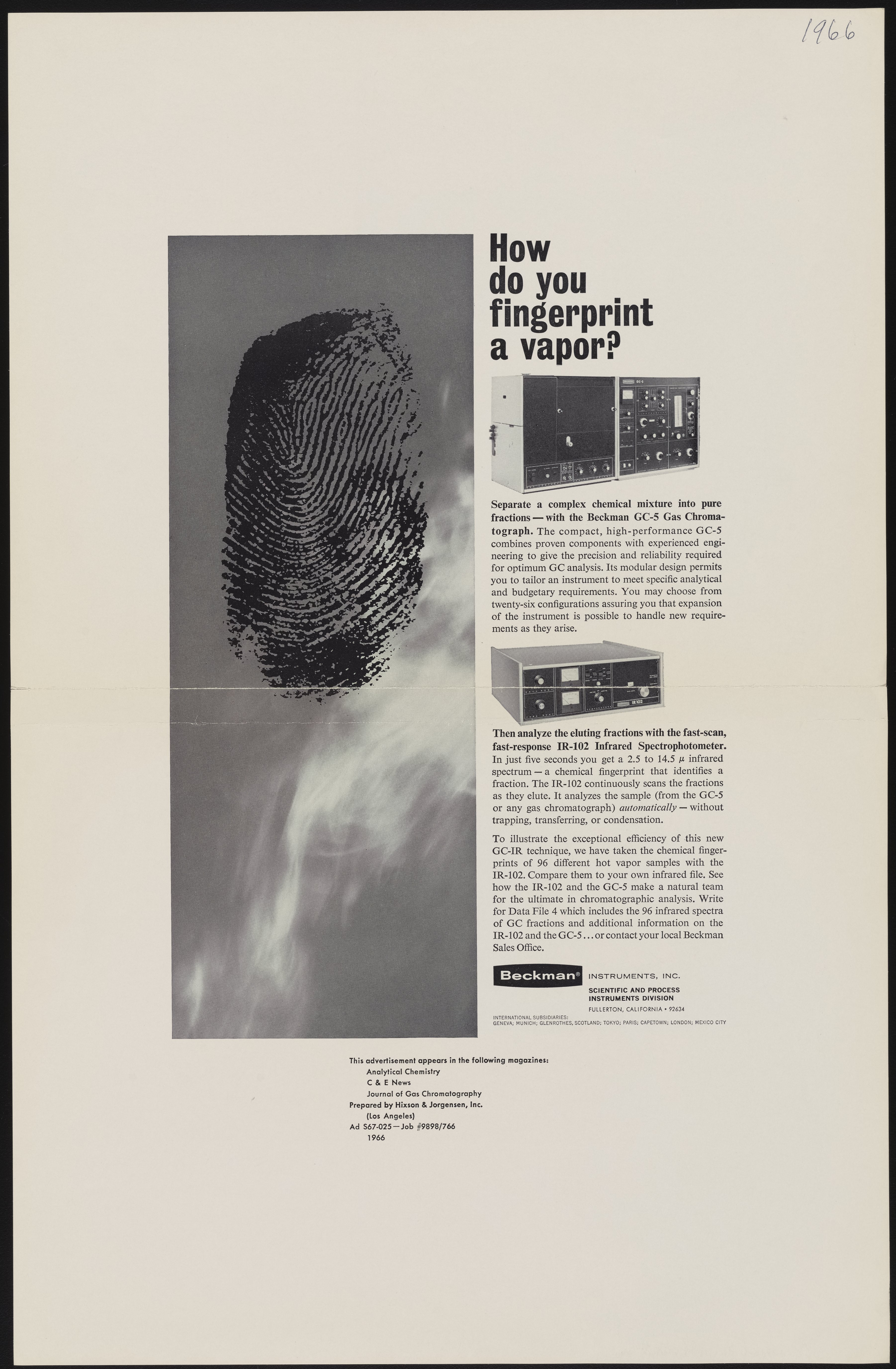 Hixson and Jorgensen, and Inc. Beckman Instruments. “How Do You Fingerprint a Vapor?,” 1966. Beckman Historical Collection, Box 49, Folder 24. Science History Institute. Philadelphia. https://digital.sciencehistory.org/works/ns064602j.