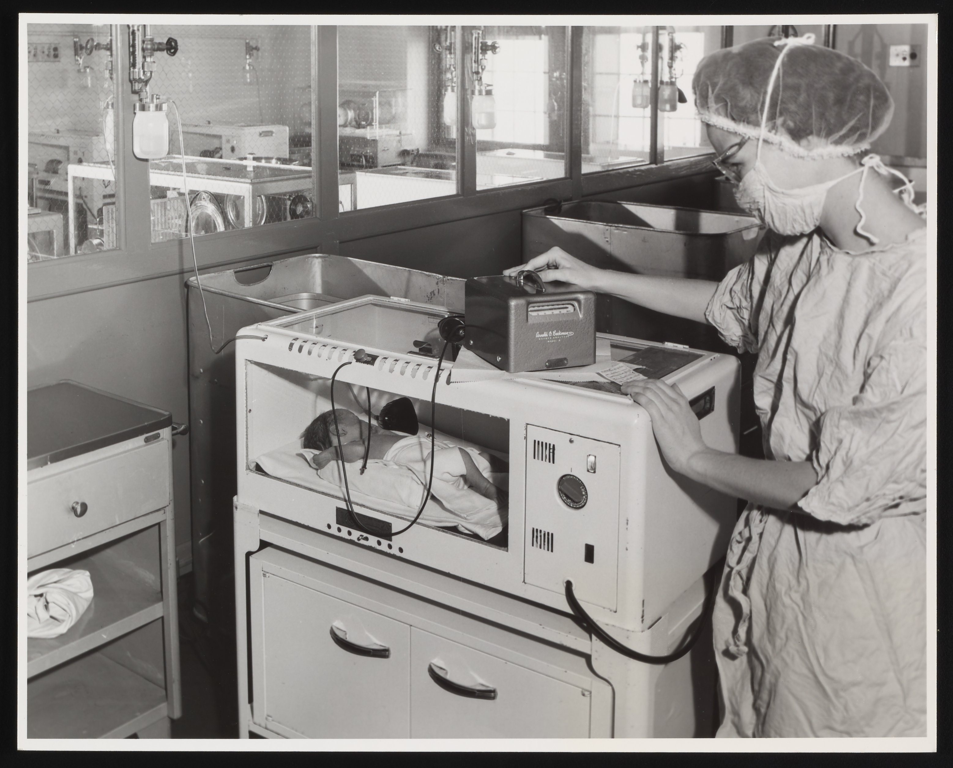 Nurse in maternity ward, using Beckman Model D oxygen analyzer to monitor an infant in an incubator