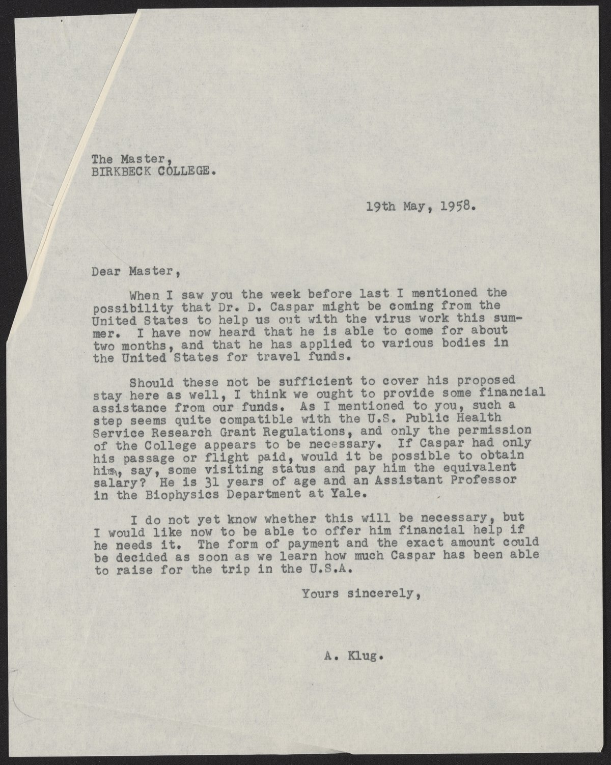 Letter from Aaron Klug to John Francis Lockwood, May 19, 1958