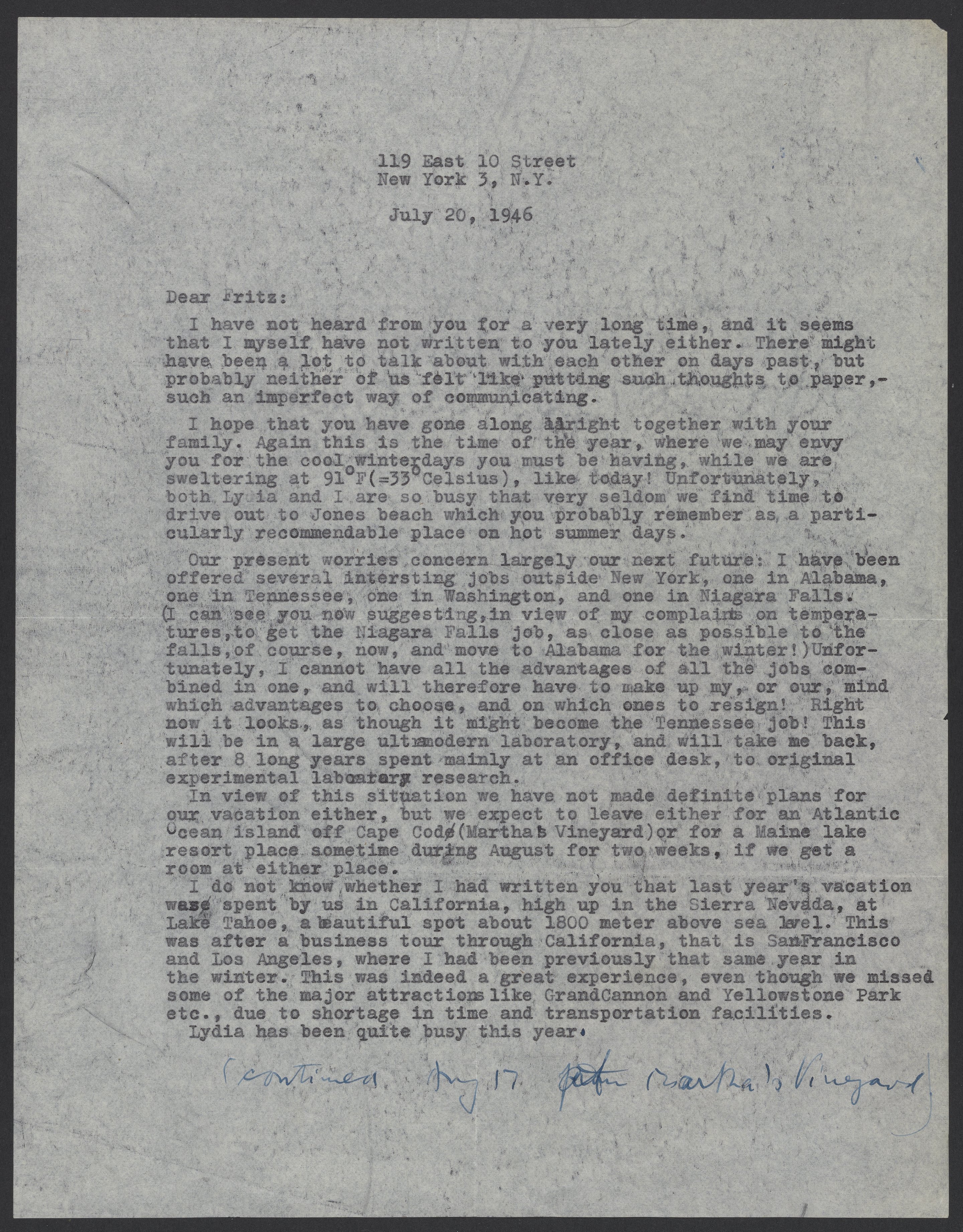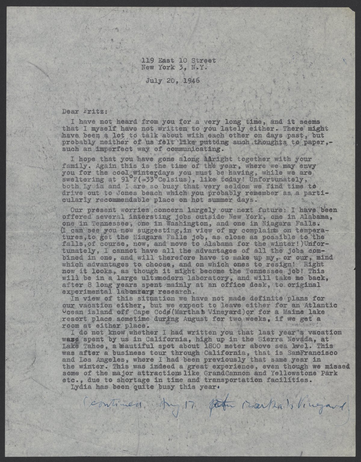 Letter from Max Bredig to Federico Schnell, July 20, 1946