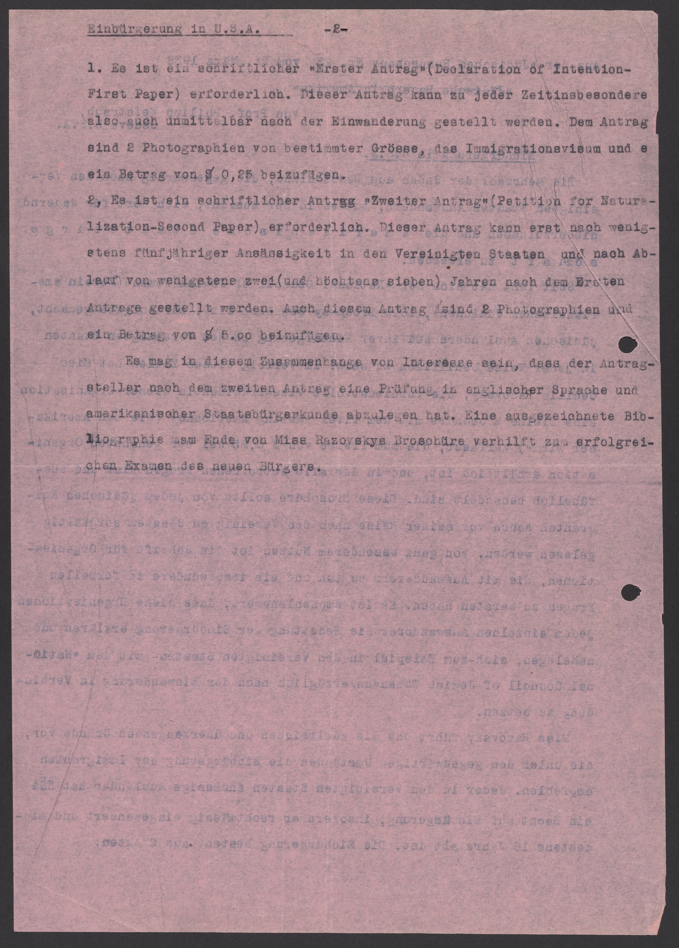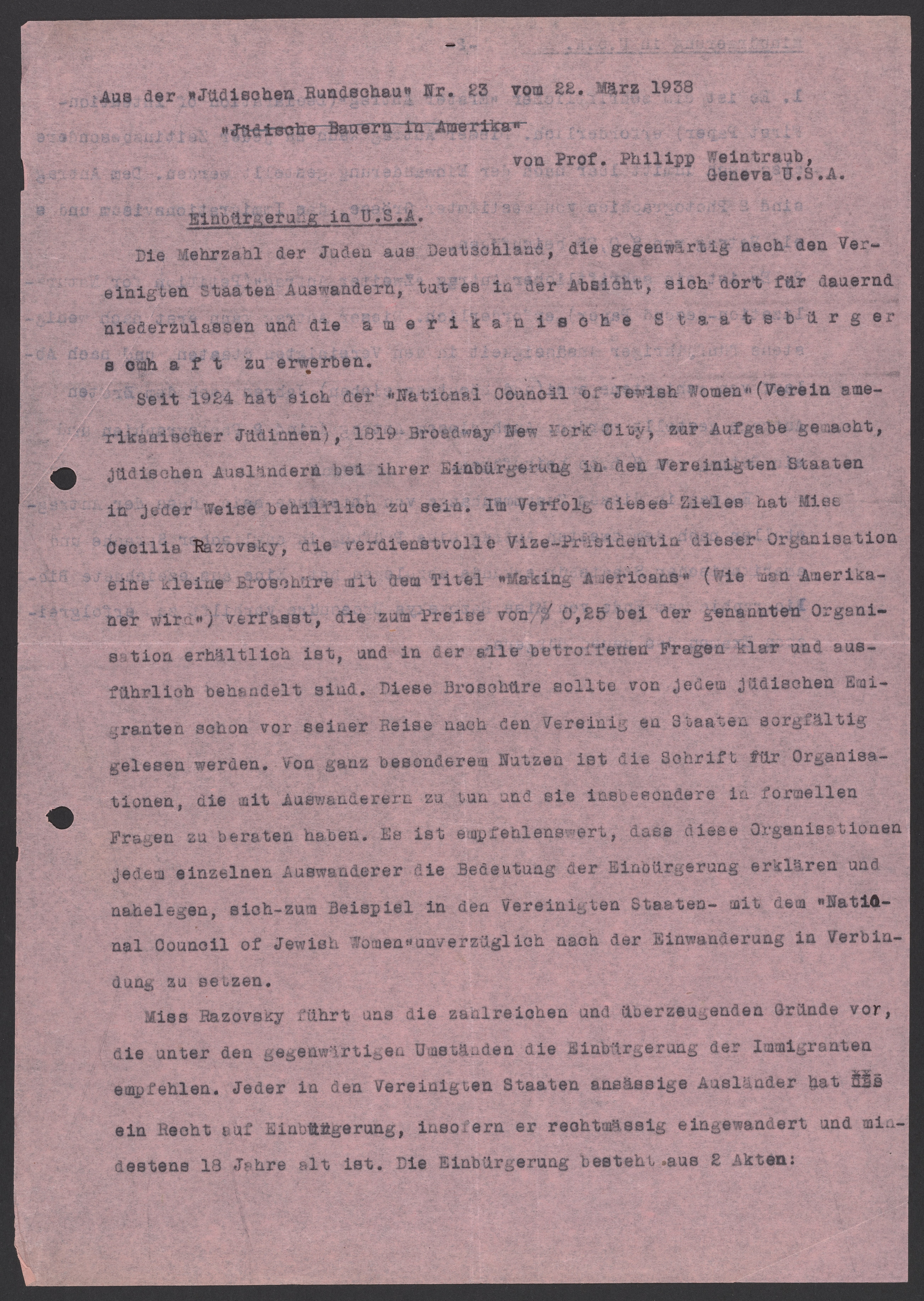 Small JPG1200 x 1689px — 413 KBLarge JPG2880 x 4053px — 2.5 MBFull-sized JPG5216 x 7341px — 7.8 MBOriginal fileTIFF — 5216 x 7341px — 110 MBCopy of an article titled Einbürgerung in U.S.A by Philipp Weintraub published in Jüdische Rundschau. Typewritten on copy paper.