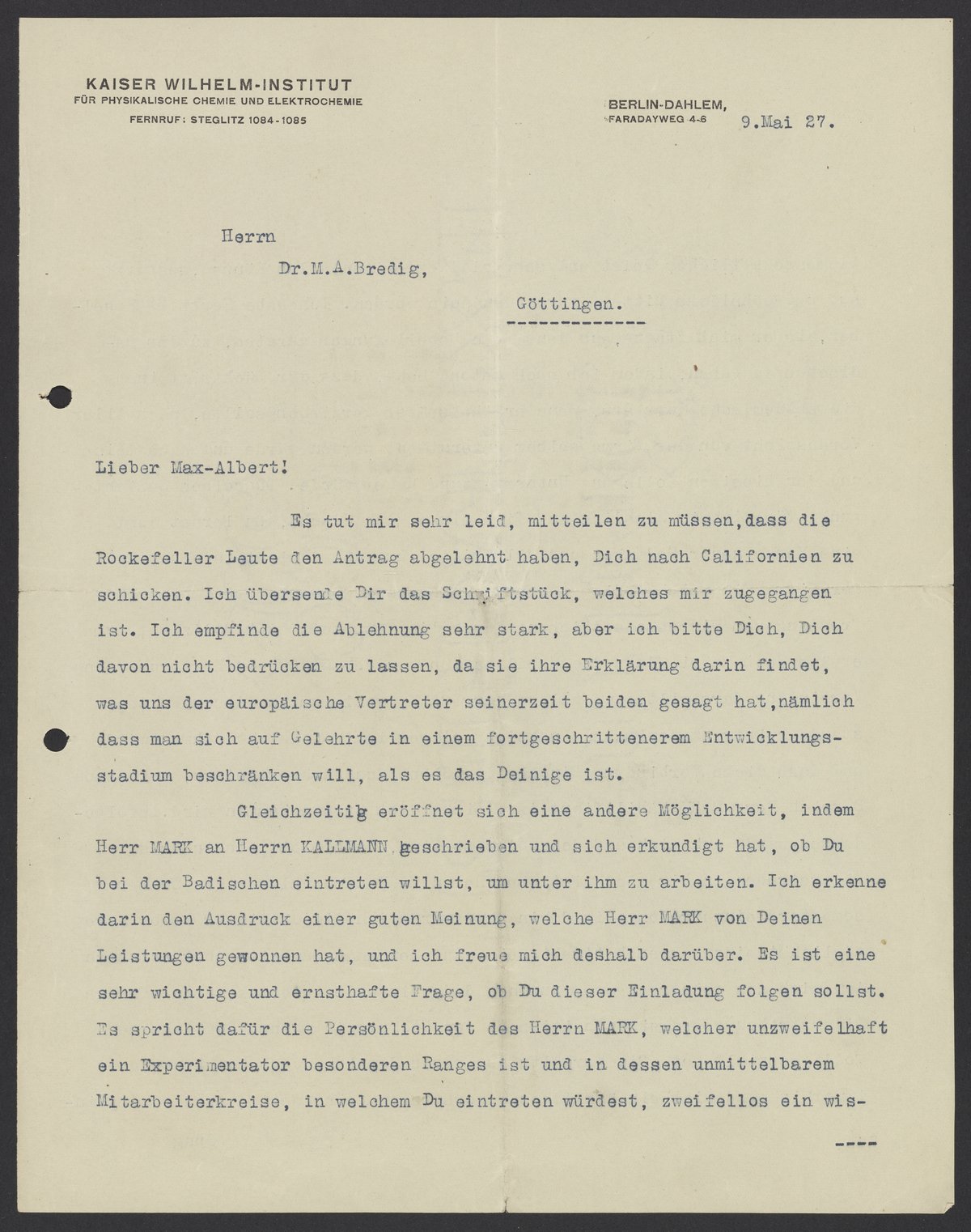 Letter from Fritz Haber to Max Bredig, May 9, 1927