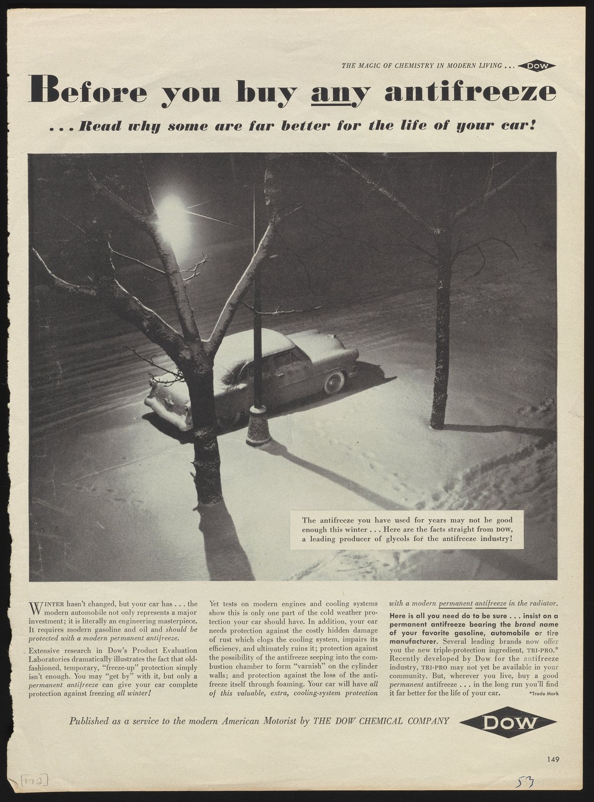Dow Chemical Company. “Before You Buy ANY Antifreeze...Read Why Some Are Far Better for the Life of Your Car!,” 1953. Advertisements from the Dow Chemical Historical Collection, Box 7. Science History Institute. Philadelphia. https://digital.sciencehistory.org/works/nv935346t.