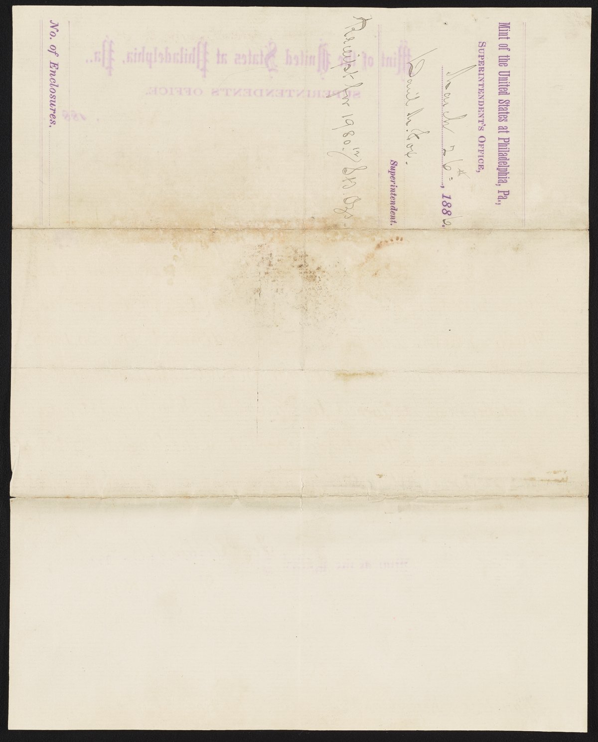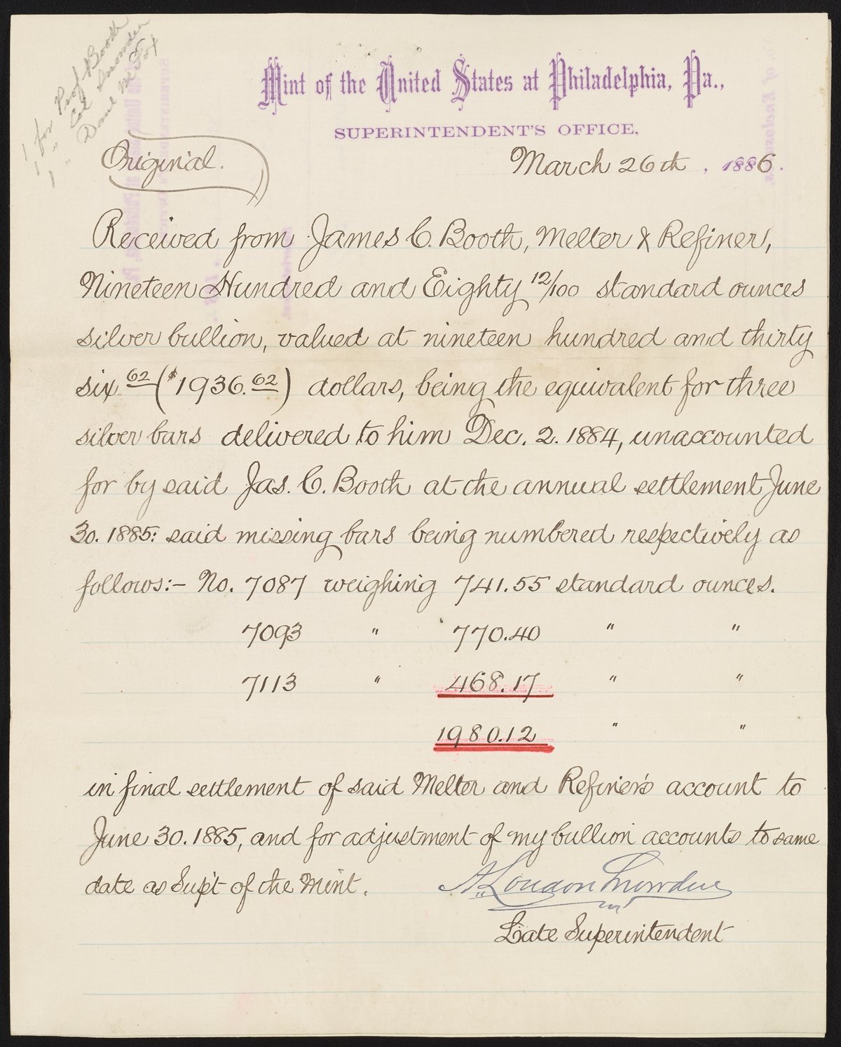 Small JPG1200 x 1494px — 264 KBLarge JPG2880 x 3585px — 1.3 MBFull-sized JPG4724 x 5880px — 3.1 MBOriginal fileTIFF — 4724 x 5880px — 79.5 MBLetter from Archibald Loudon Snowden (1835-1912) Superintendent of the United States Mint at Philadelphia from 1879 to 1885, to James Curtis Booth (1810-1888), confirming the receipt of payment for three unaccounted for silver bars, valued at $1936 USD.
