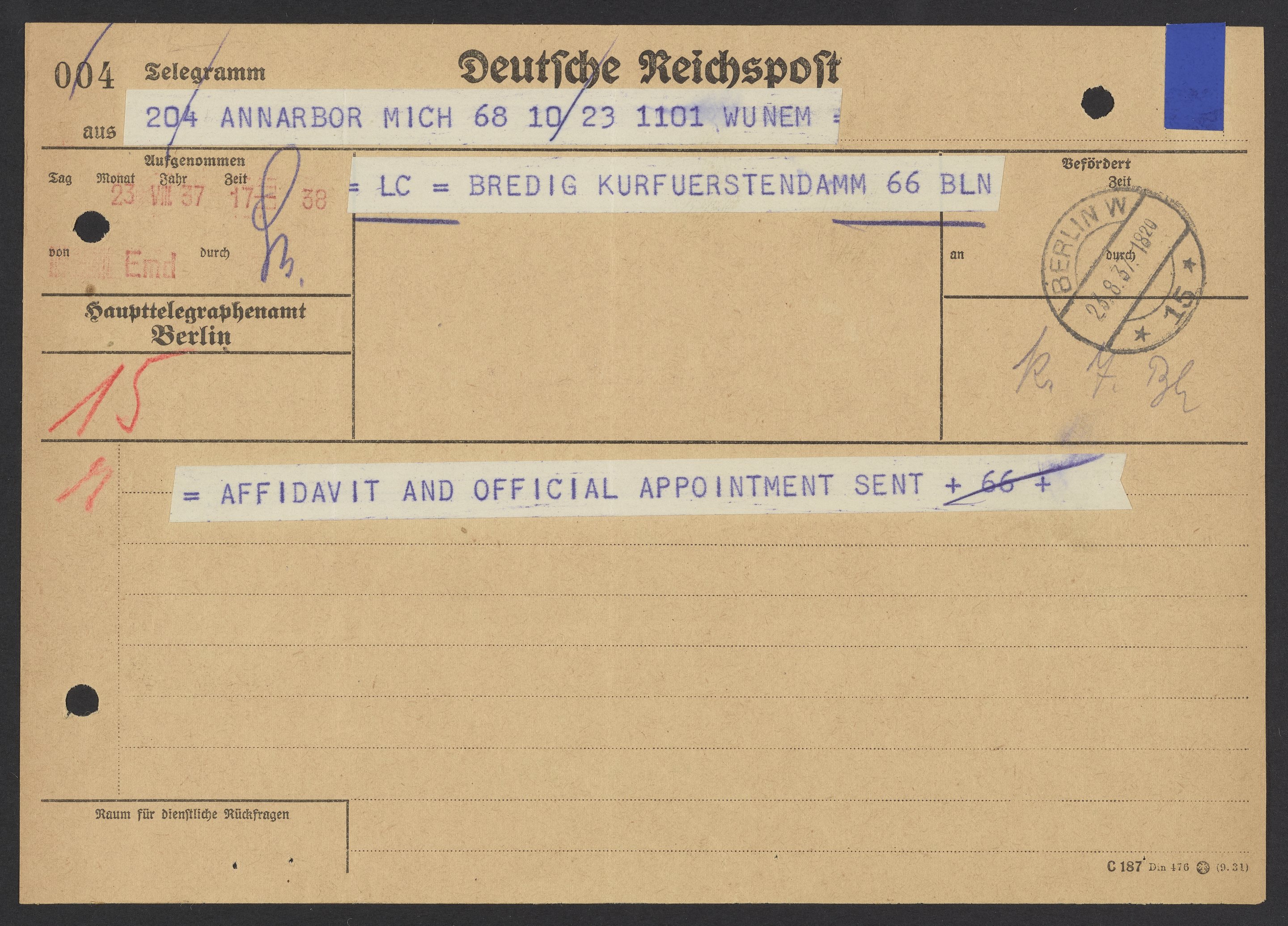 Kasmir Fajans (1887-1975) informs Max Bredig (1902-1977) by telegram that his affidavit for Bredig's American immigration visa and an appointment letter from the University of Michigan have been sent to him in Berlin, In 1937, after Bredig had experienced prejudice in his workplace and conditions began to worsen for Jewish citizens in Germany, Fajans helped Bredig secure a fellowship at the University of Michigan so that he could emigrate.