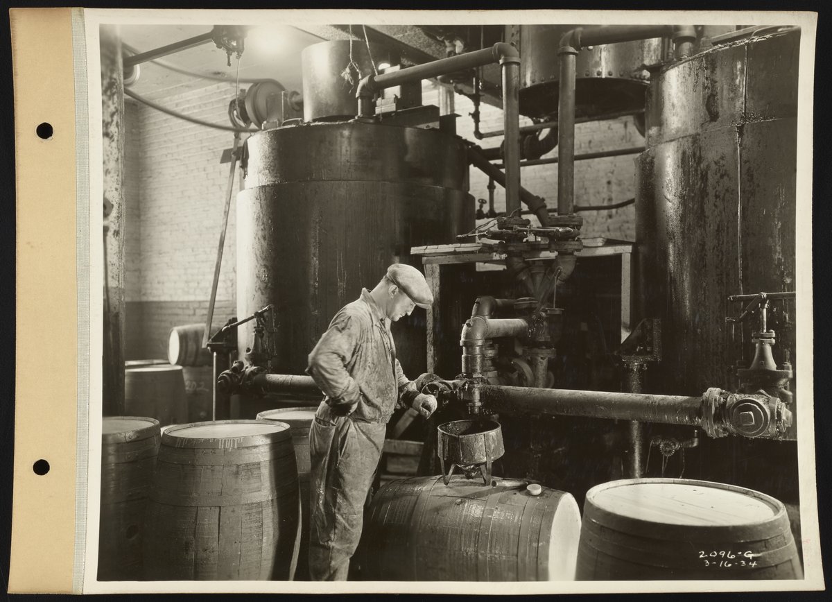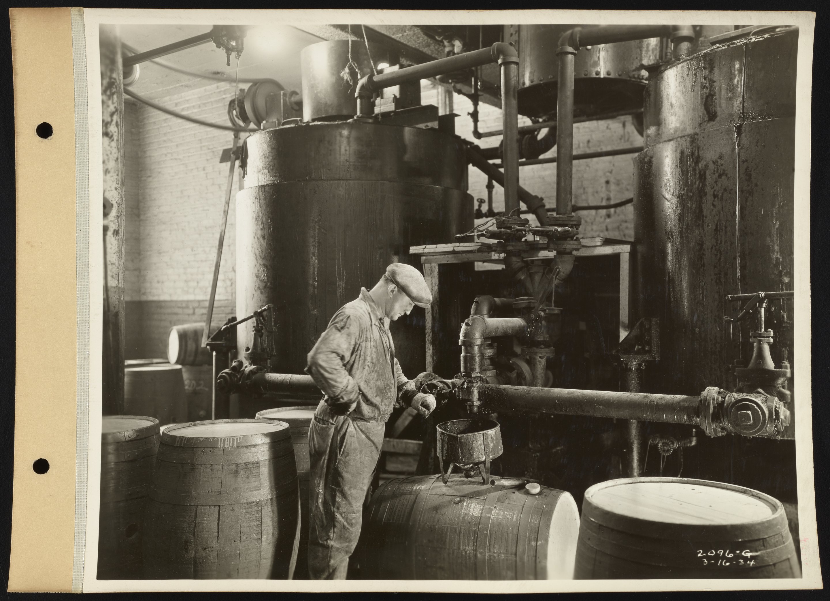 General view of employee Walter Perry filling a barrel with an anti-foam water treatment produced at the Dearborn Chemical Company's 35th Street laboratory facility and manufacturing plant. Founded in 1887, the Dearborn Chemical Company was a corporate ancestor of BetzDearborn, Incorporated best known for manufacturing water treatment chemicals for use in boilers and cooling towers.